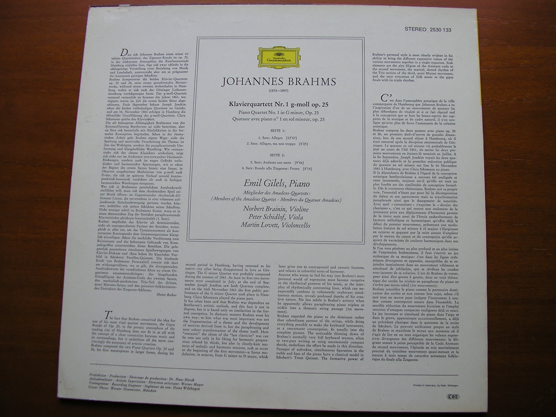 2530 133  BRAHMS: PIANO QUARTET Op. 25    EMIL GILELS / NORBERT BRAININ / PETER SCHIDLOF / MARTIN LOVETT
