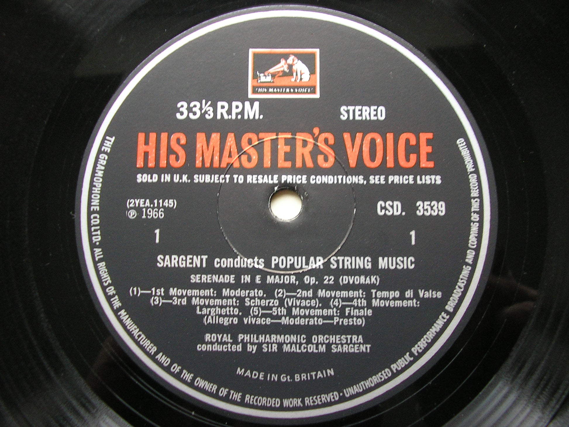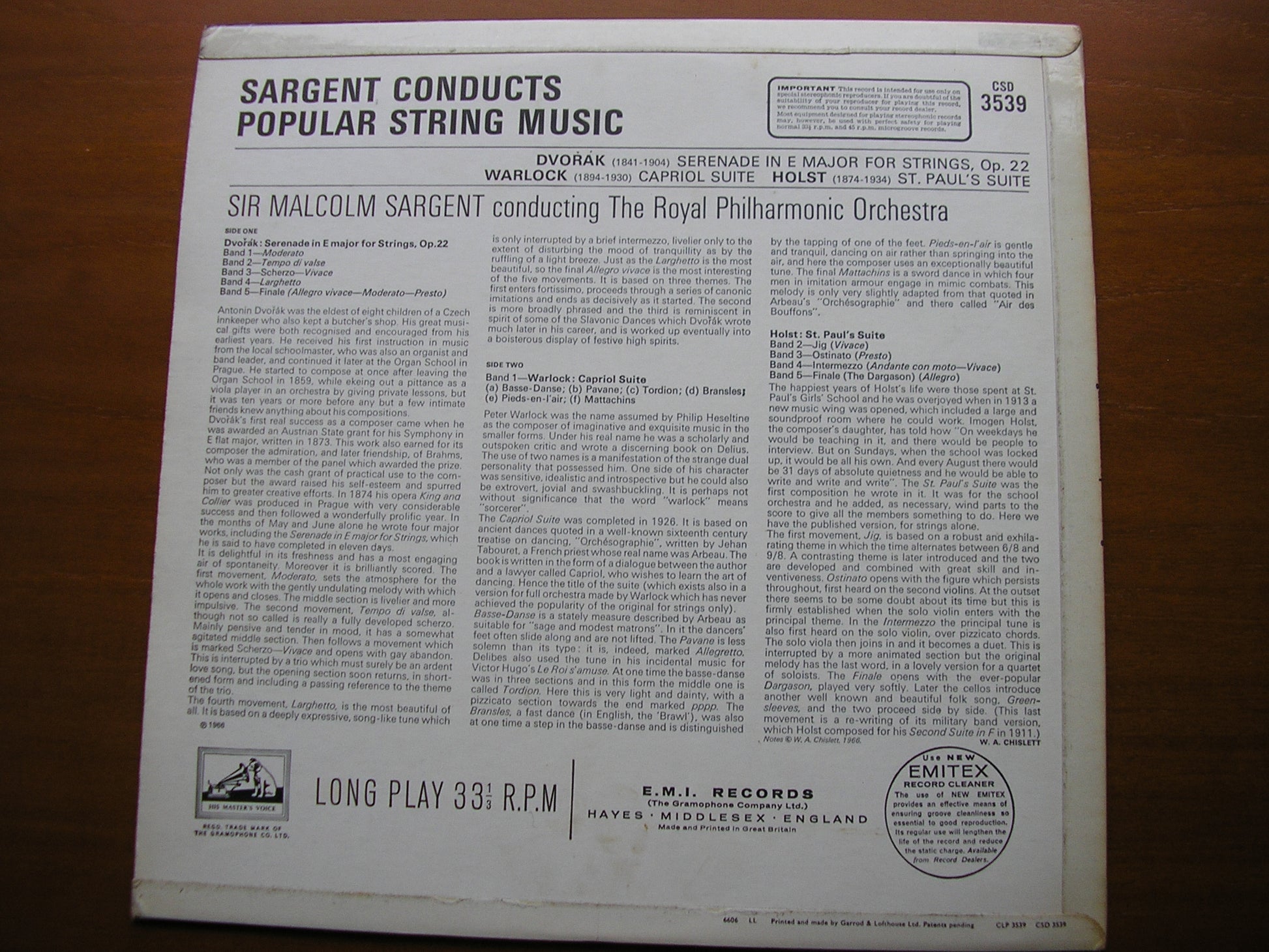 CSD 3539  DVORAK: SERENADE / WARLOCK: CAPRIOL SUITE / HOLST: St. PAUL'S SUITE   SIR MALCOLM SARGENT / ROYAL PHILHARMONIC ORCHESTRA
