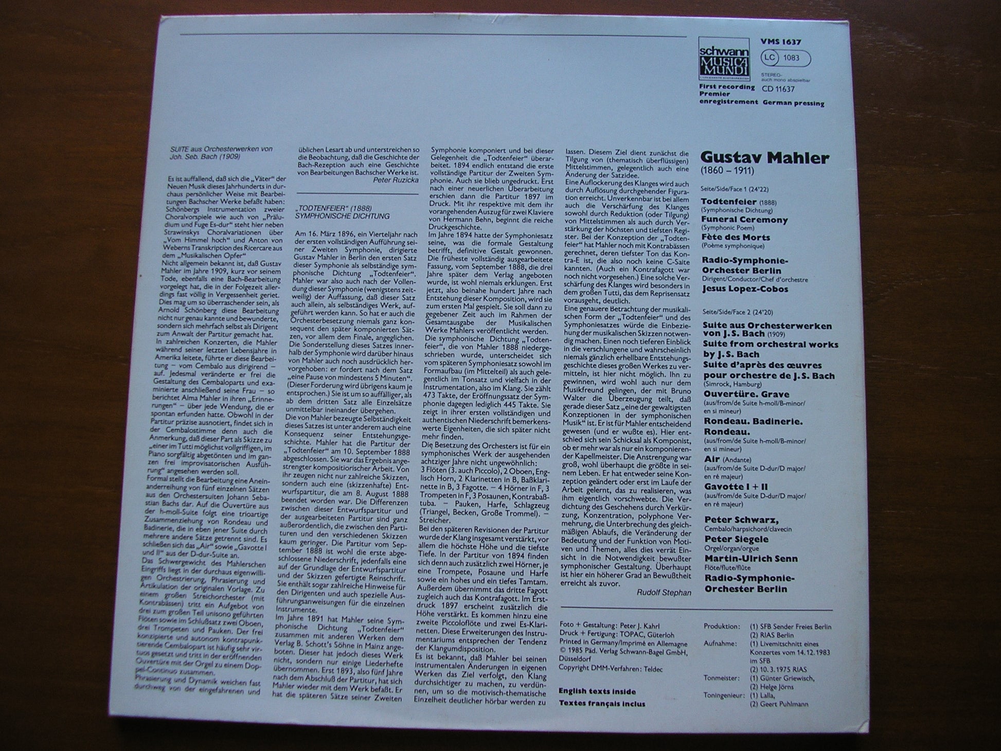MAHLER: TODTENFEIER / SUITE FROM WORKS OF JS BACH SOLOISTS / BERLIN RADIO ORCHESTRA / JESUS LOPEZ - COBOS VMS 1637