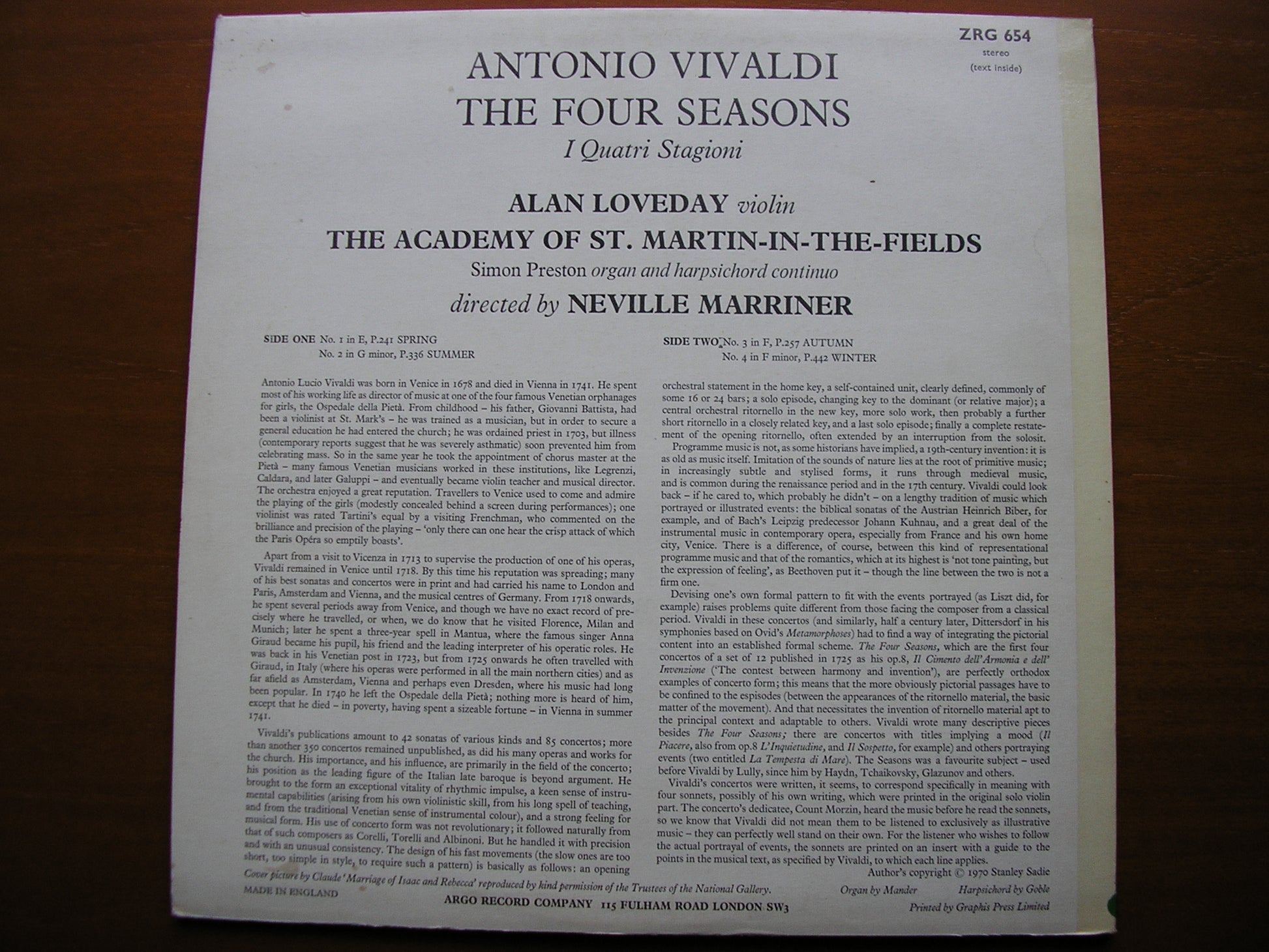ZRG 654  VIVALDI: THE FOUR SEASONS    ALAN LOVEDAY / ACADEMY OF ST MARTIN IN THE FIELDS / NEVILLE MARRINER