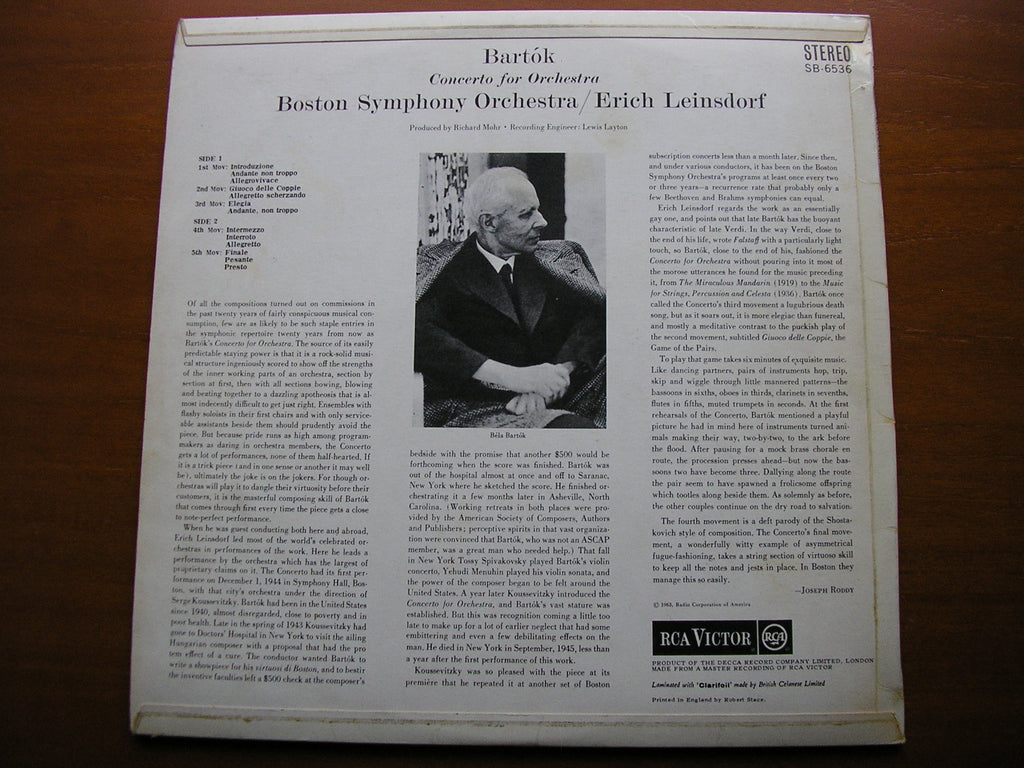 BARTOK: CONCERTO FOR ORCHESTRA LEINSDORF / BOSTON SYMPHONY SB 6536