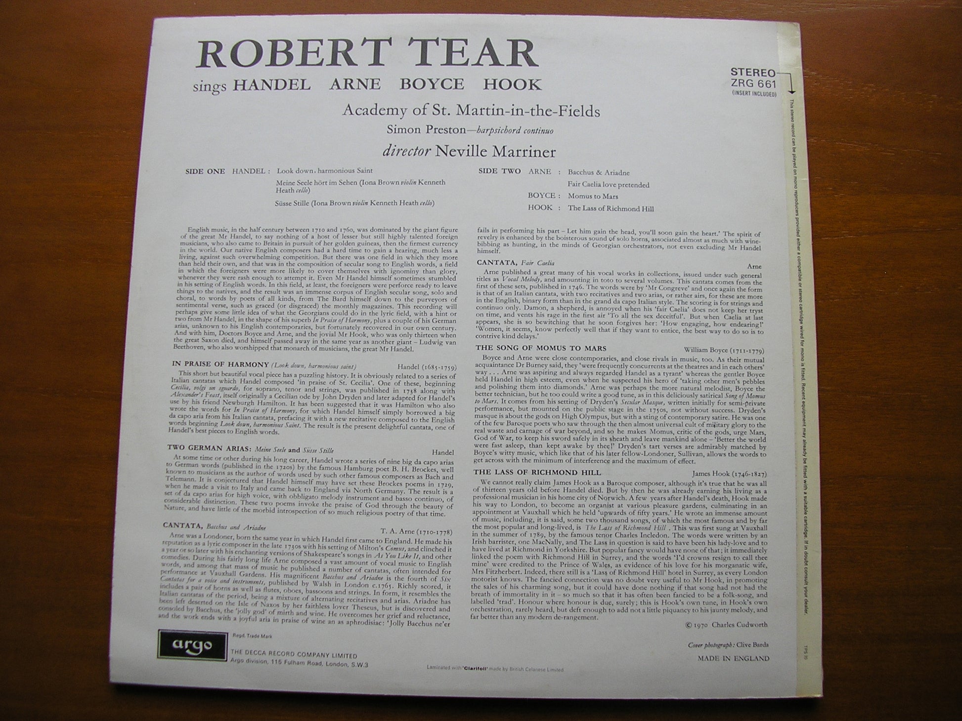 ZRG 661  ARNE / HOOK / BOYCE / HANDEL: SONGS / ARIAS / CANTATAS      ROBERT TEAR / ACADEMY OF SAINT MARTIN IN THE FIELDS / NEVILLE MARRINER