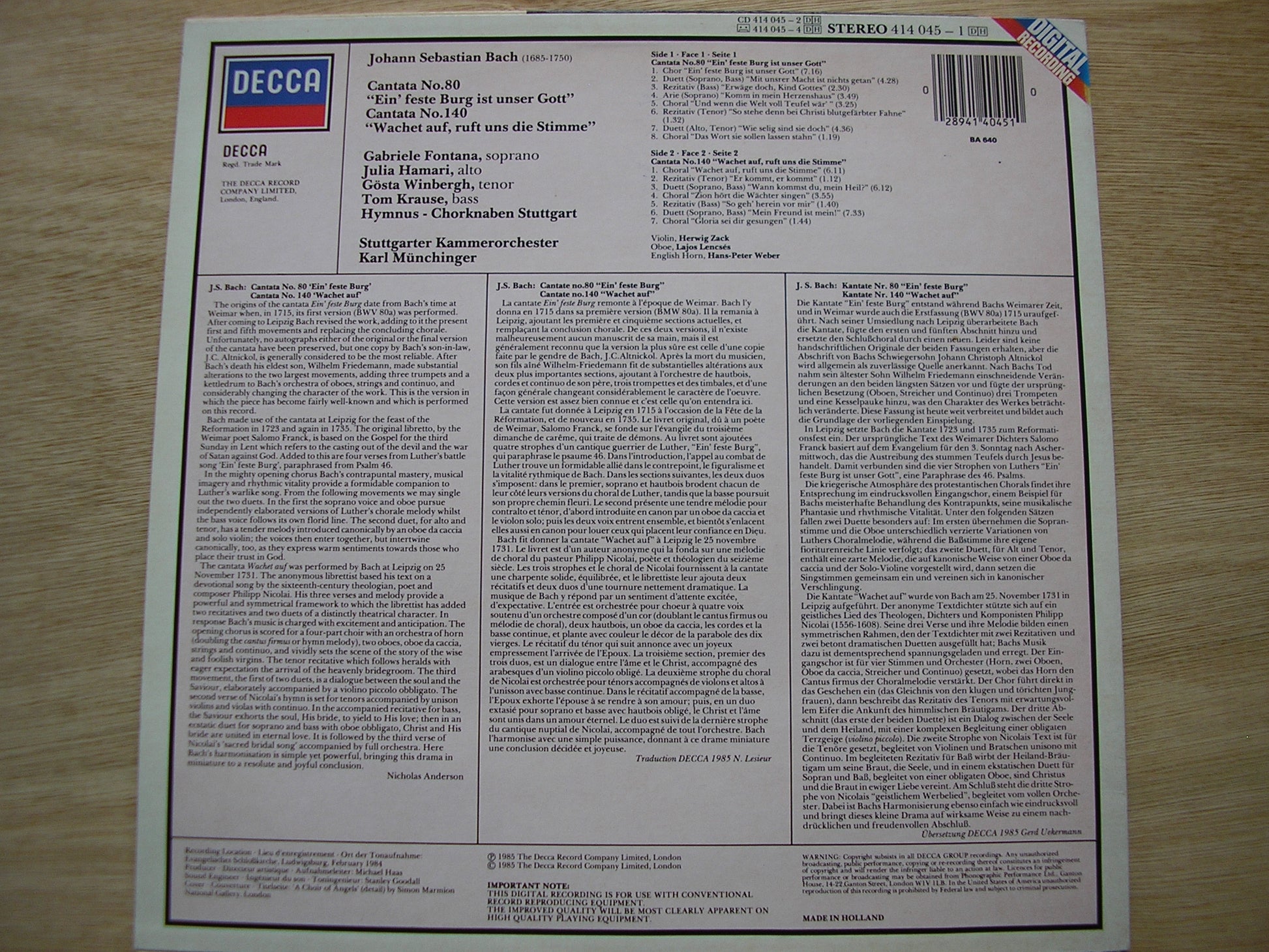 414 045  BACH: CANTATAS Nos. 80 & 140      GABRIELE FONTANA / JULIA HAMARI / GOSTA WINBERGH / TOM KRAUSE / STUTTGART CHAMBER ORCHESTRA