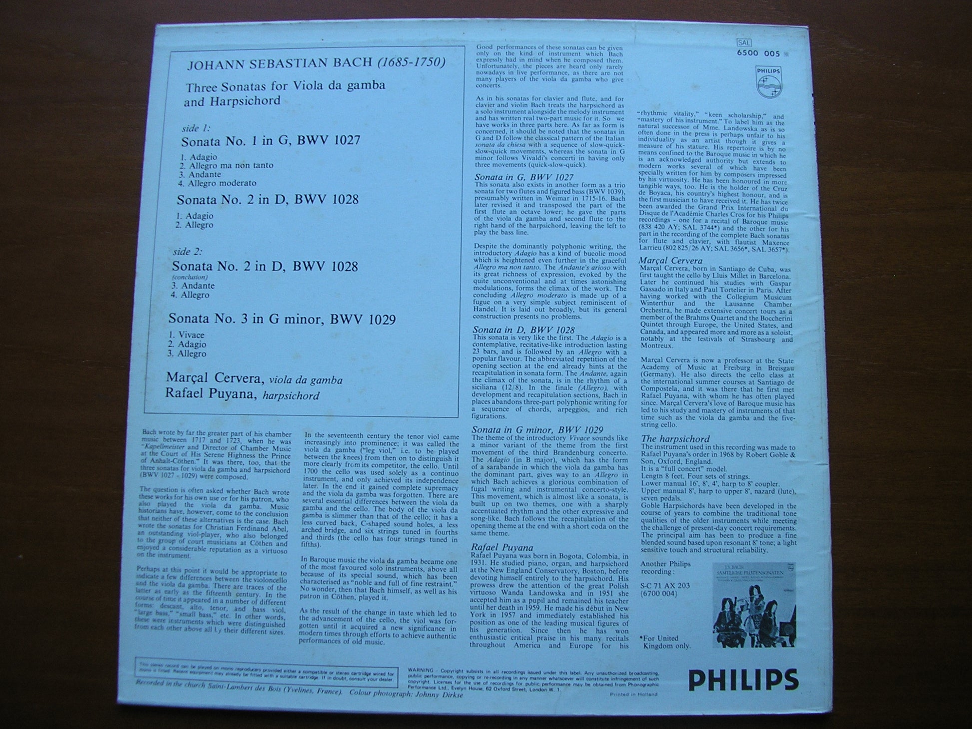 6500 005  BACH: THREE SONATAS BWV 1027 - 1029       MARCAL CERVERA / RAFAEL PUYANA