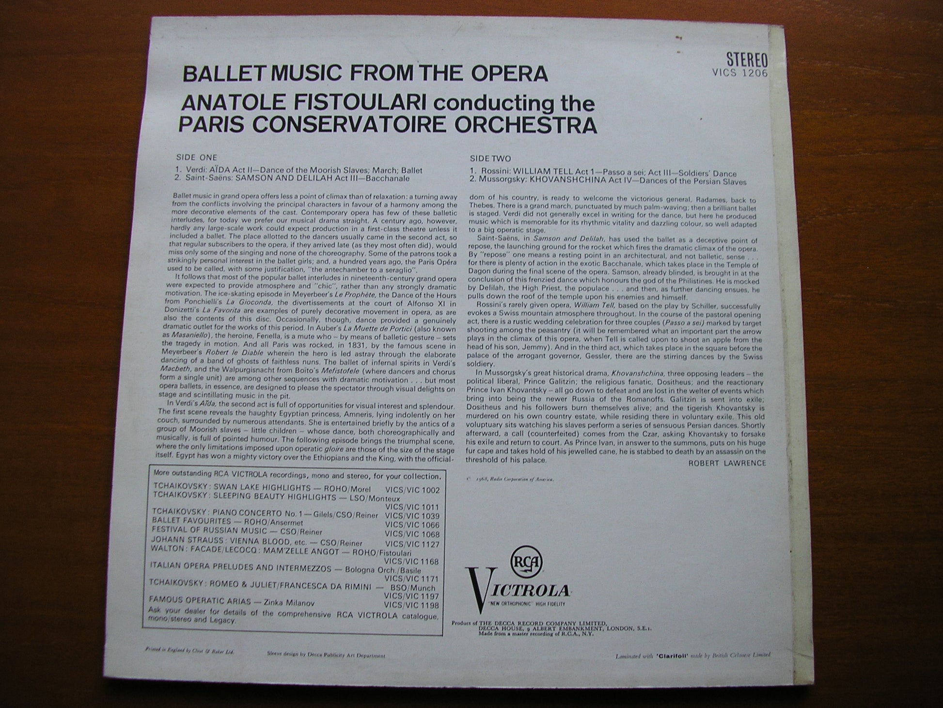 VICS 1206  BALLET MUSIC FROM THE OPERA: VERDI / MUSSORGSKY / SAINT-SAENS / ROSSINI       ANATOLE FISTOULARI / PARIS CONSERVATOIRE