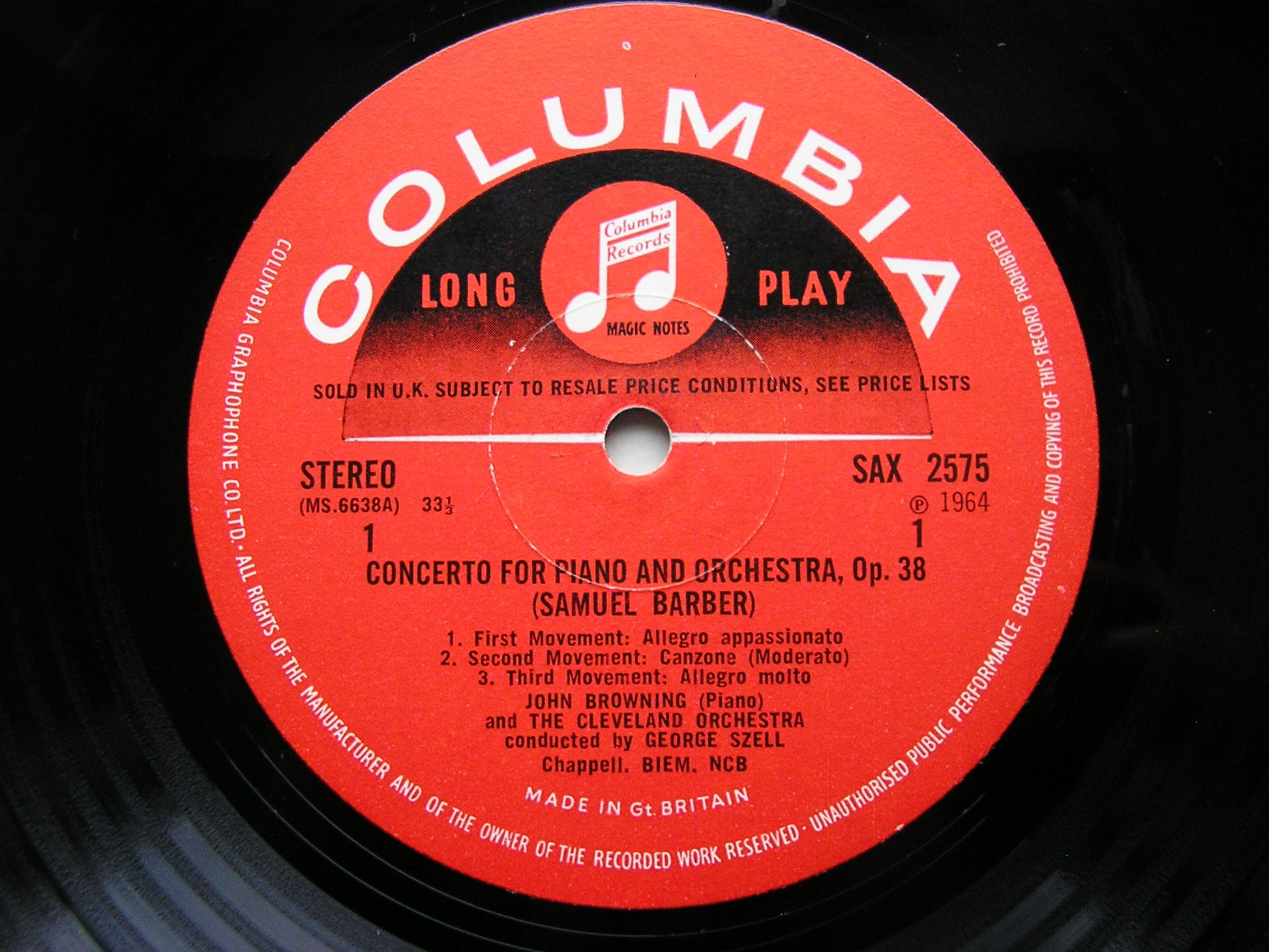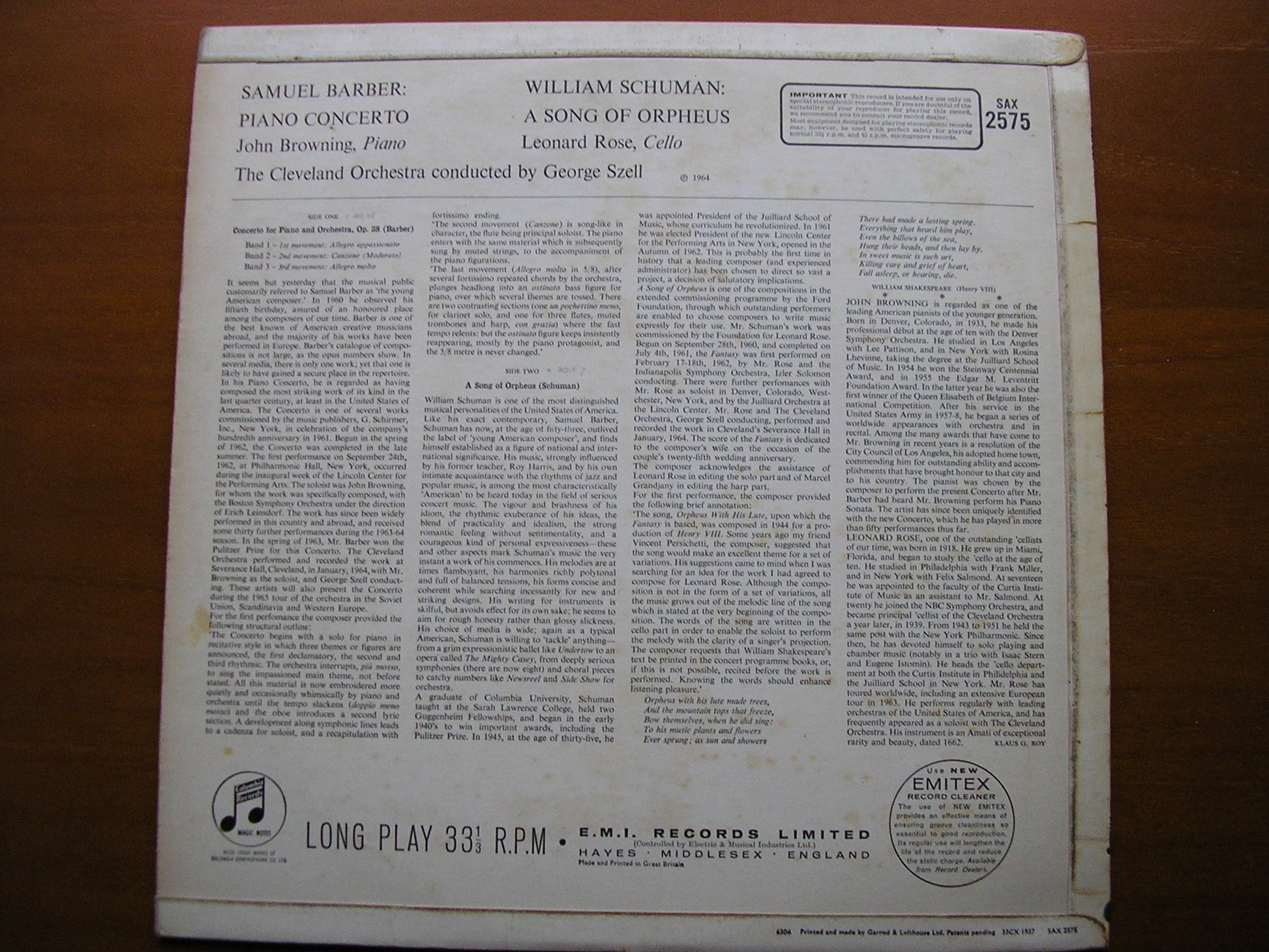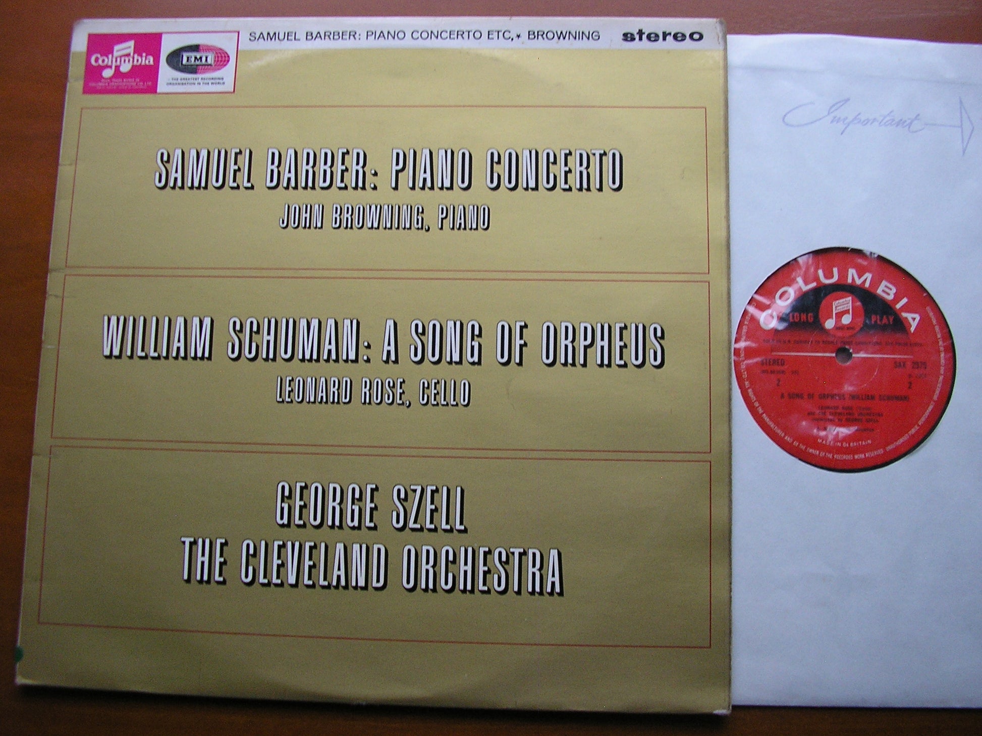 SAX 2575  BARBER: PIANO CONCERTO    JOHN BROWNING / SCHUMAN: A SONG OF ORPHEUS     LEONARD ROSE / CLEVELAND ORCHESTRA / GEORGE SZELL