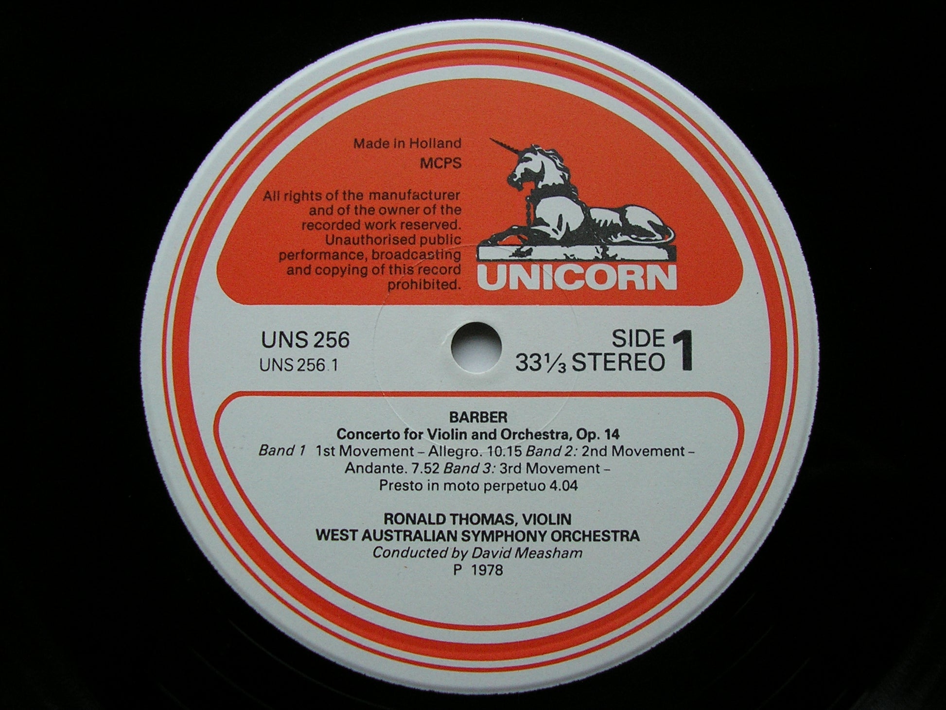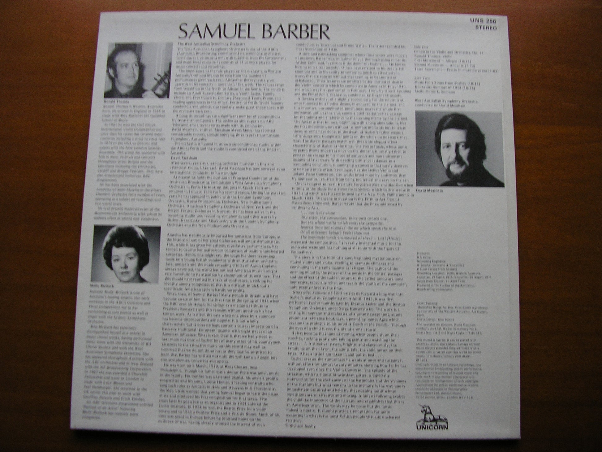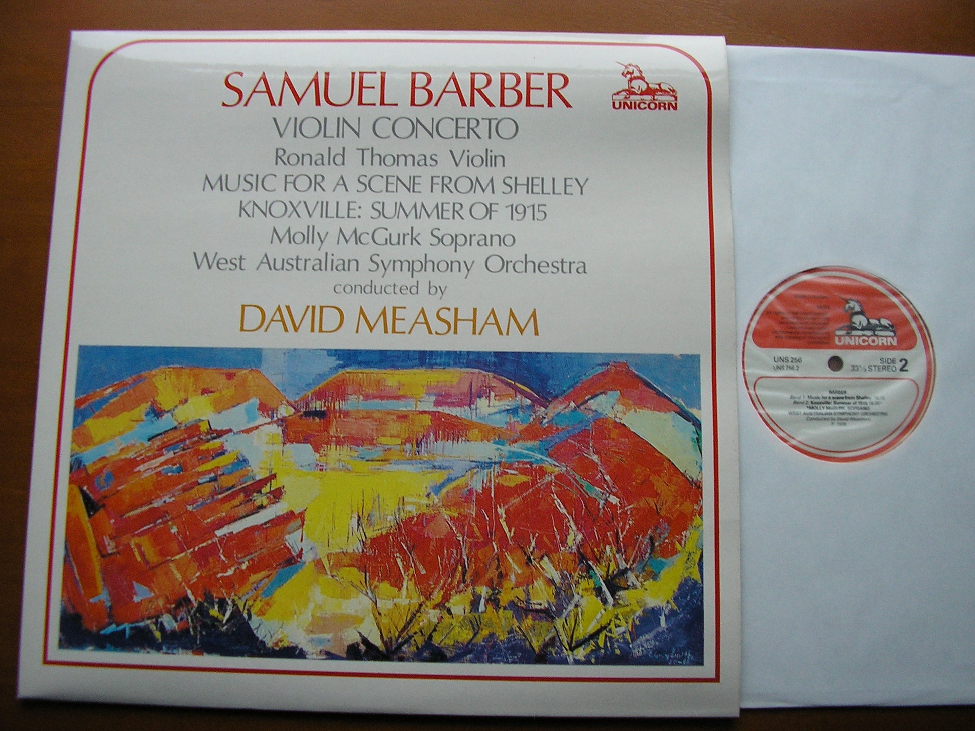 UNS 256  BARBER: VIOLIN CONCERTO / SHELLEY / KNOXVILLE Summer of 1915     RONALD THOMAS / MOLLY McGURK / WEST AUSTRALIAN SYMPHONY ORCHESTRA / DAVID MEASHAM