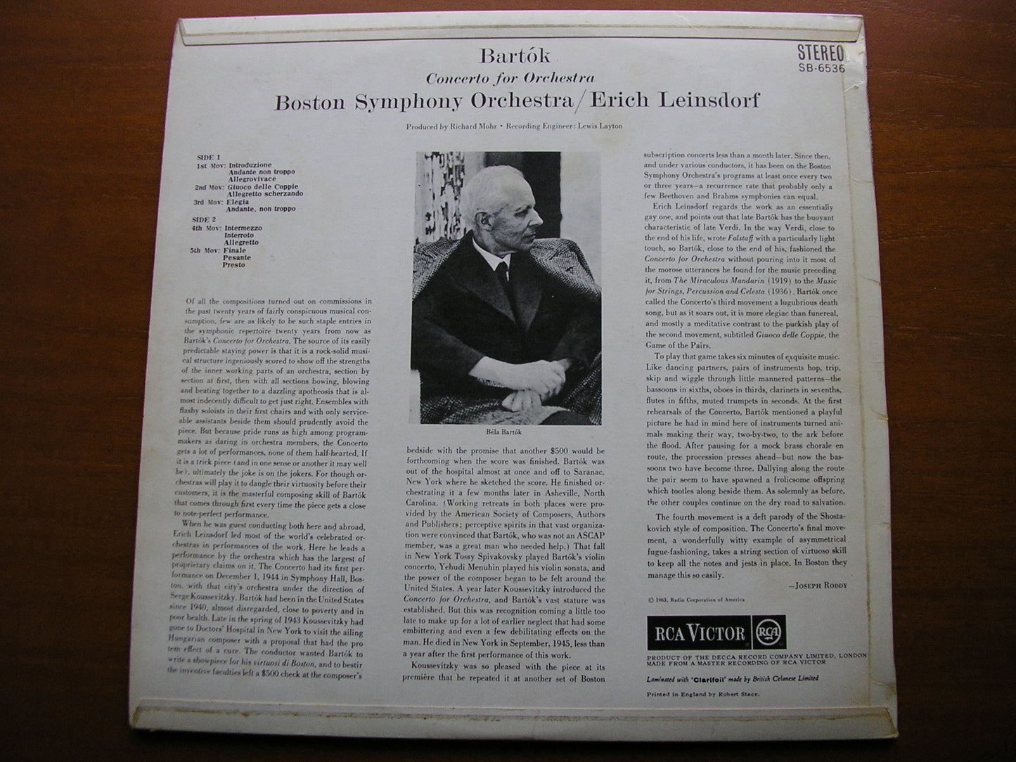 SB 6536  BARTOK: CONCERTO FOR ORCHESTRA    ERICH LEINSDORF / BOSTON SYMPHONY ORCHESTRA