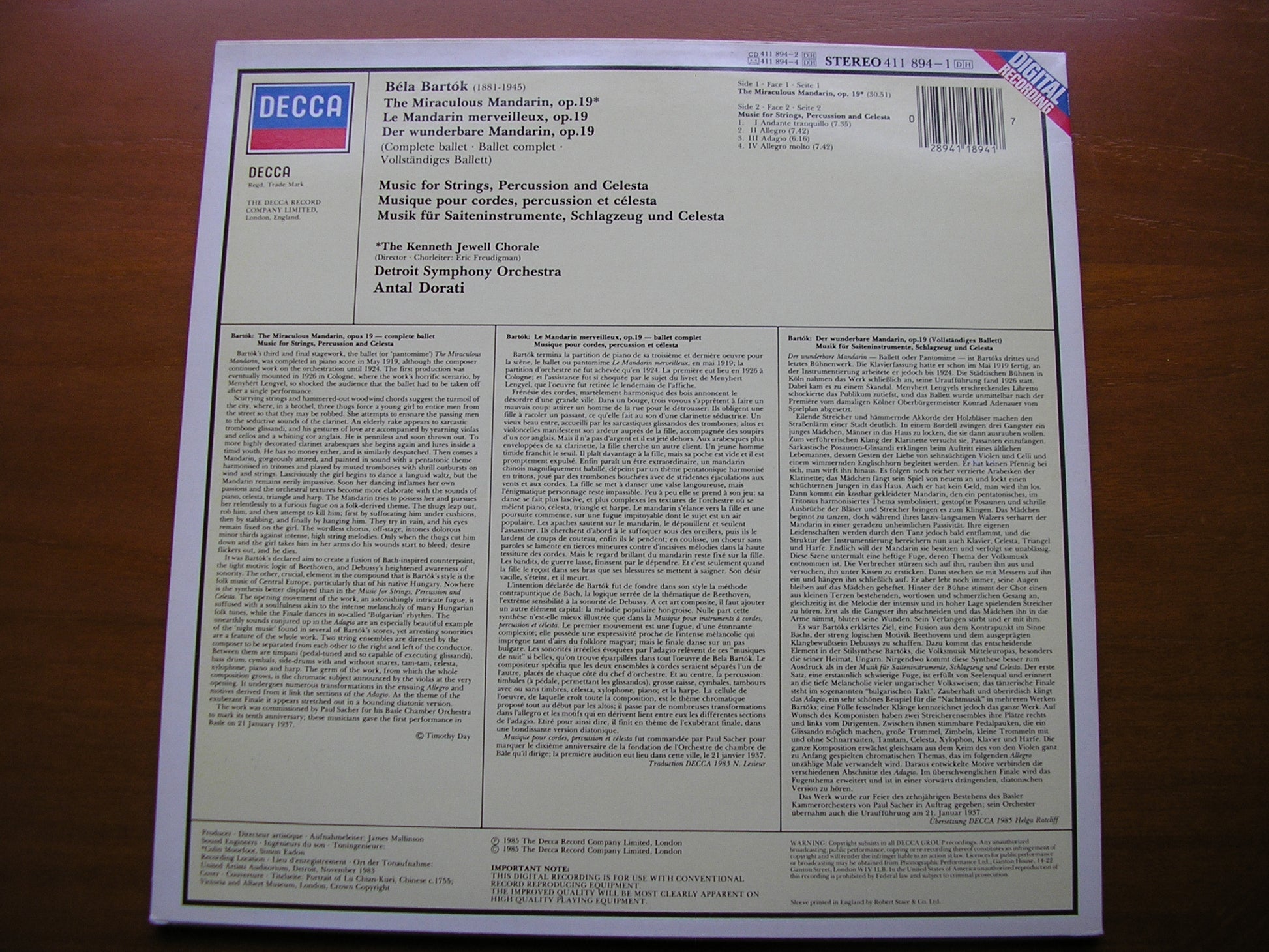 411 894  BARTOK: THE MIRACULOUS MANDARIN / MUSIC FOR STRINGS, PERCUSSION & CELESTA      ANTAL DORATI / DETROIT SYMPHONY ORCHESTRA