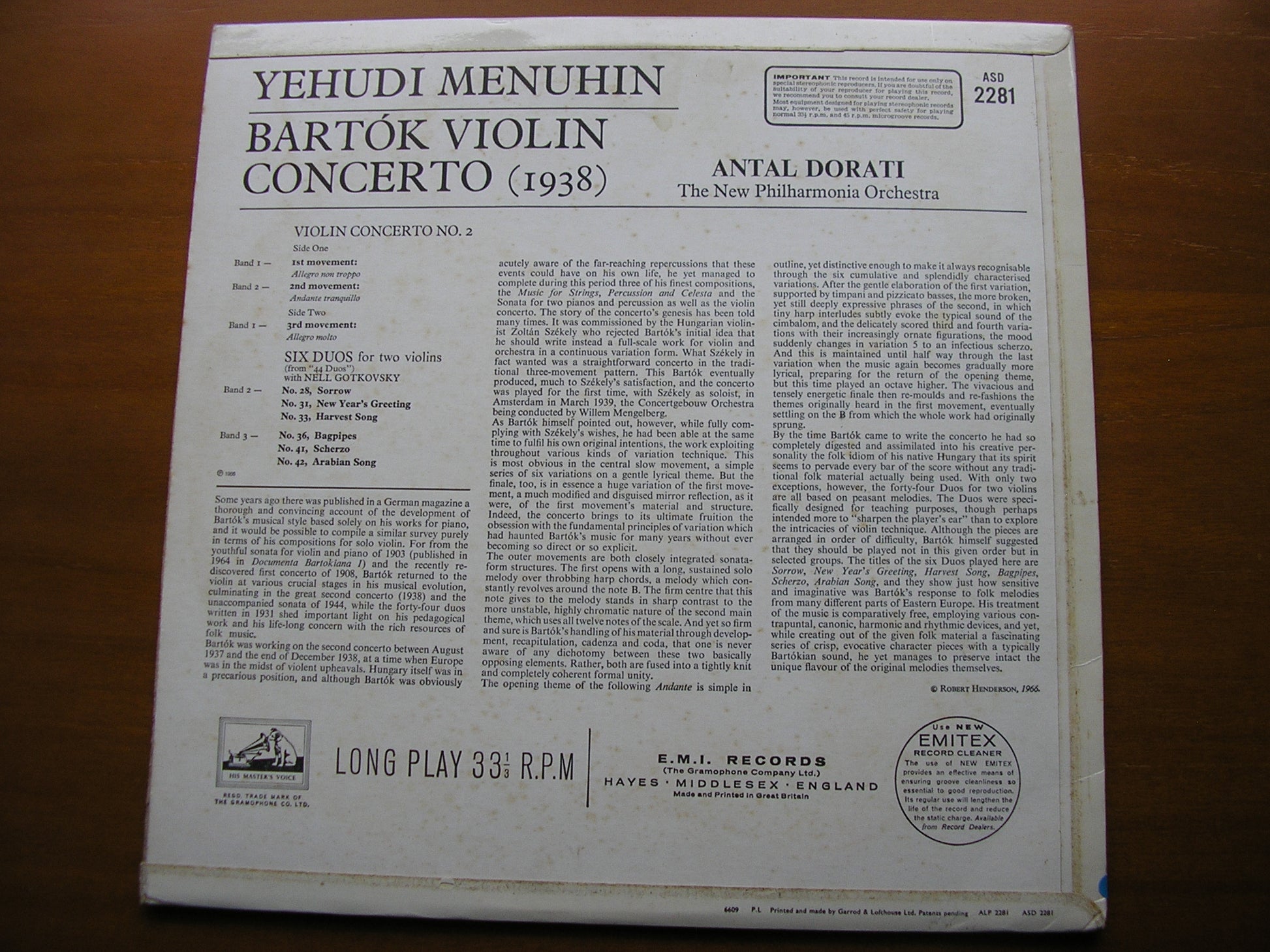 ASD 2281  BARTOK: VIOLIN CONCERTO No. 2 / SIX DUOS FOR TWO VIOLINS    YEHUDI MENUHIN / NELL GOTKOVSKY / NEW PHILHARMONIA ORCHESTRA / ANTAL DORATI