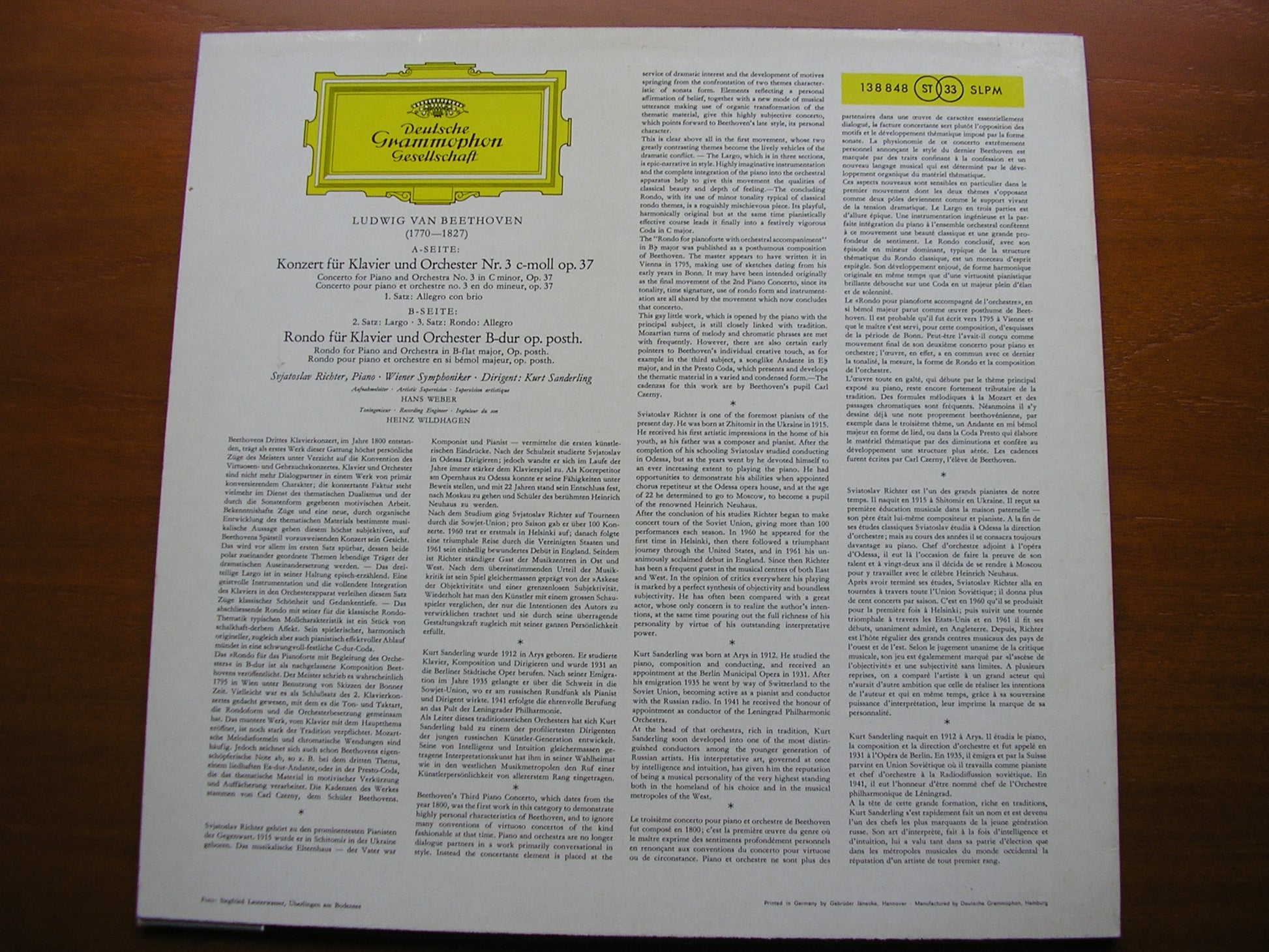 138 848  BEETHOVEN: PIANO CONCERTO No. 3 / RONDON in B     SVIATOSLAV RICHTER / VIENNA SYMPHONY ORCHESTRA /KURT SANDERLING
