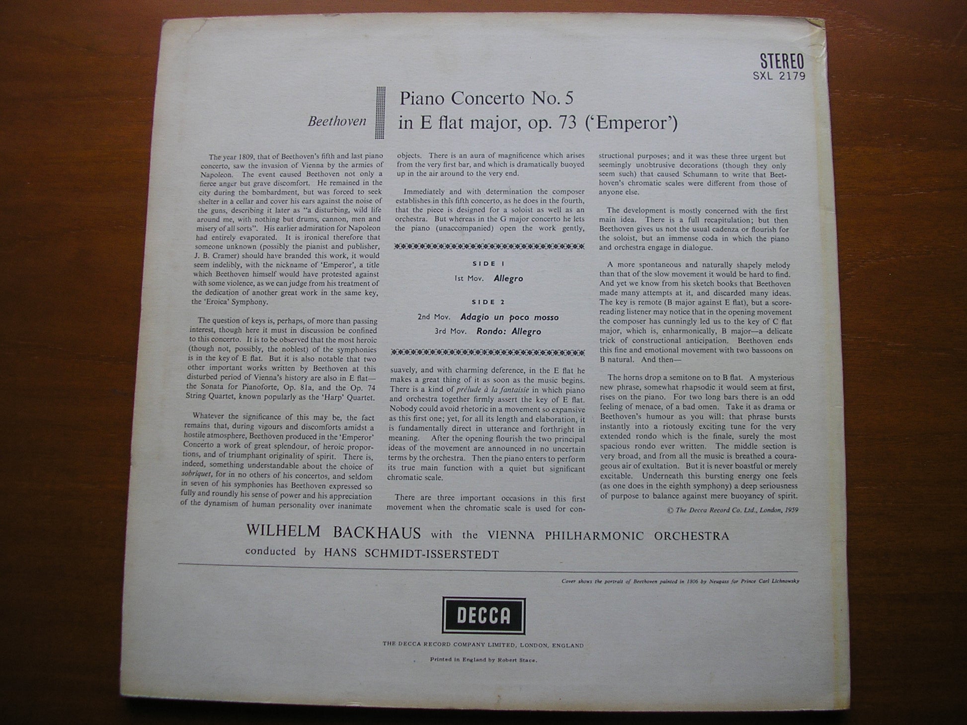 SXL 2179  BEETHOVEN: PIANO CONCERTO No. 5   WILHELM BACKHAUS / VIENNA PHILHARMONIC ORCHESTRA / HANS SCHMIDT-ISSERSTEDT