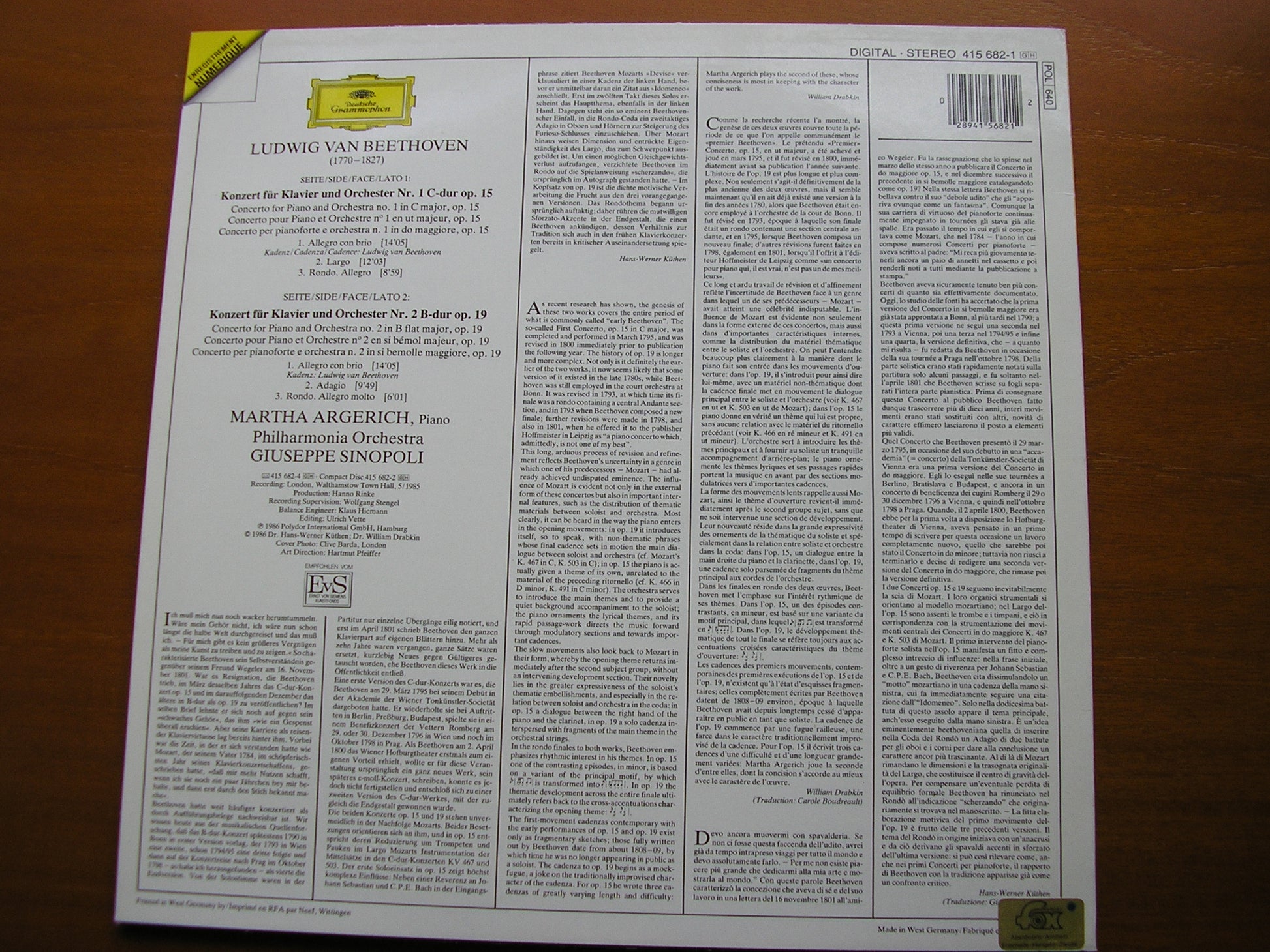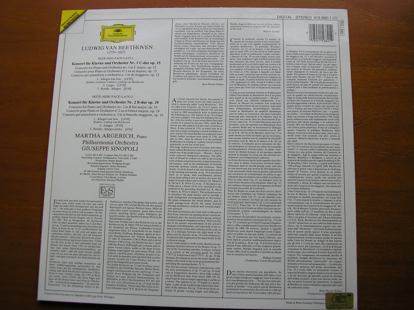 BEETHOVEN: PIANO CONCERTOS Nos. 1 & 2 ARGERICH / PHILHARMONIA / SINOPOLI 415 682