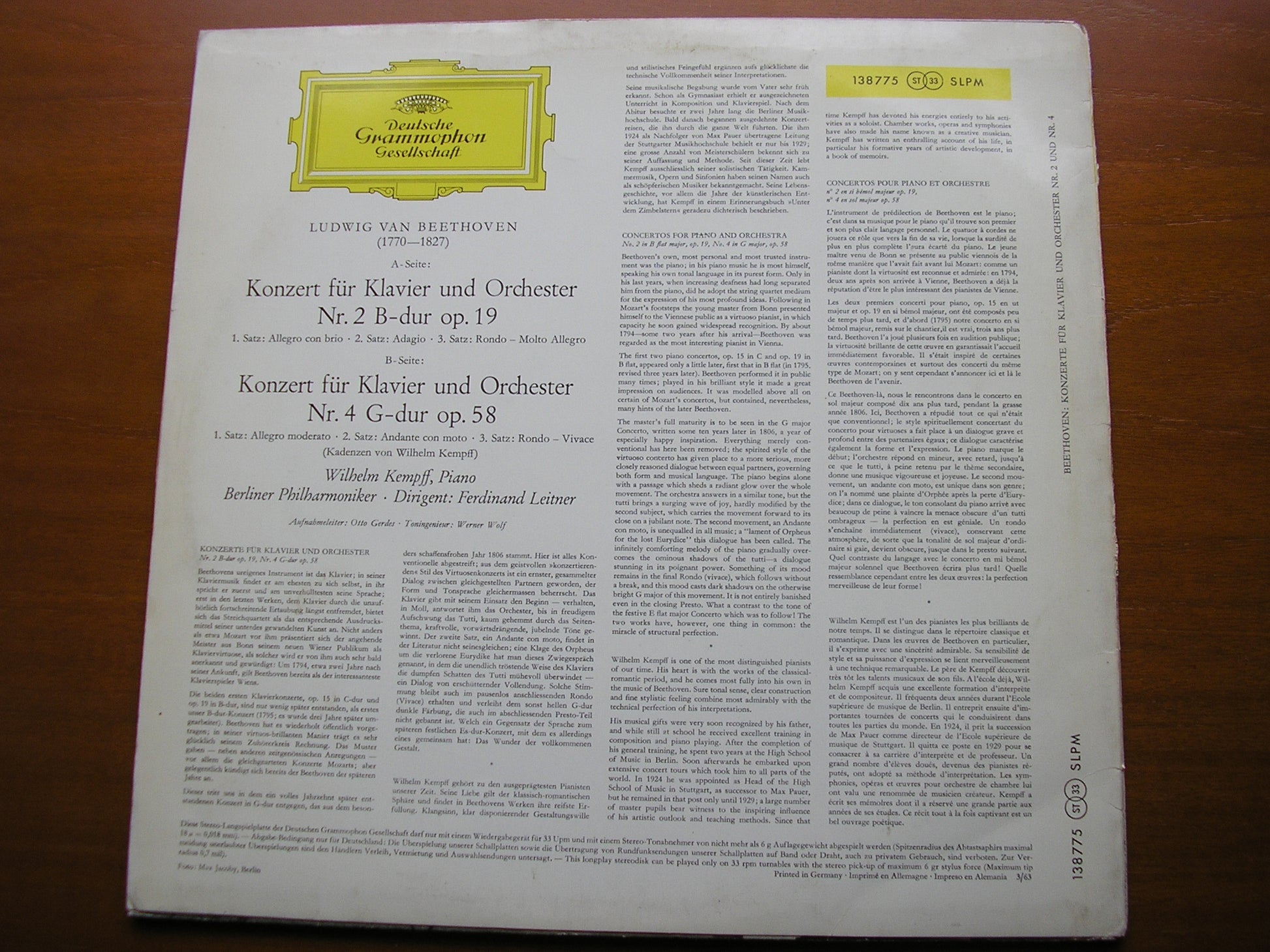 138 775  BEETHOVEN: PIANO CONCERTOS Nos. 2 & 4     WILHELM KEMPFF / BERLIN PHILHARMONIC ORCHESTRA / FERDINAND LEITNER