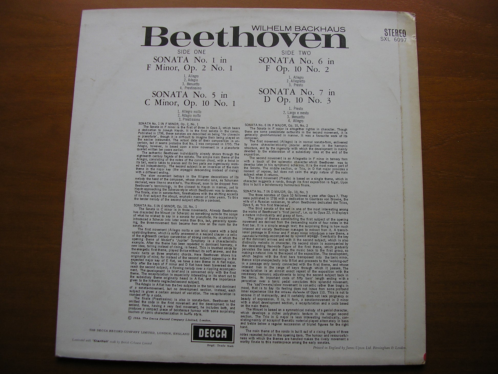SXL 6097  BEETHOVEN: PIANO SONATAS Nos. 1 / 5 / 6 / 7     WILHELM BACKHAUS