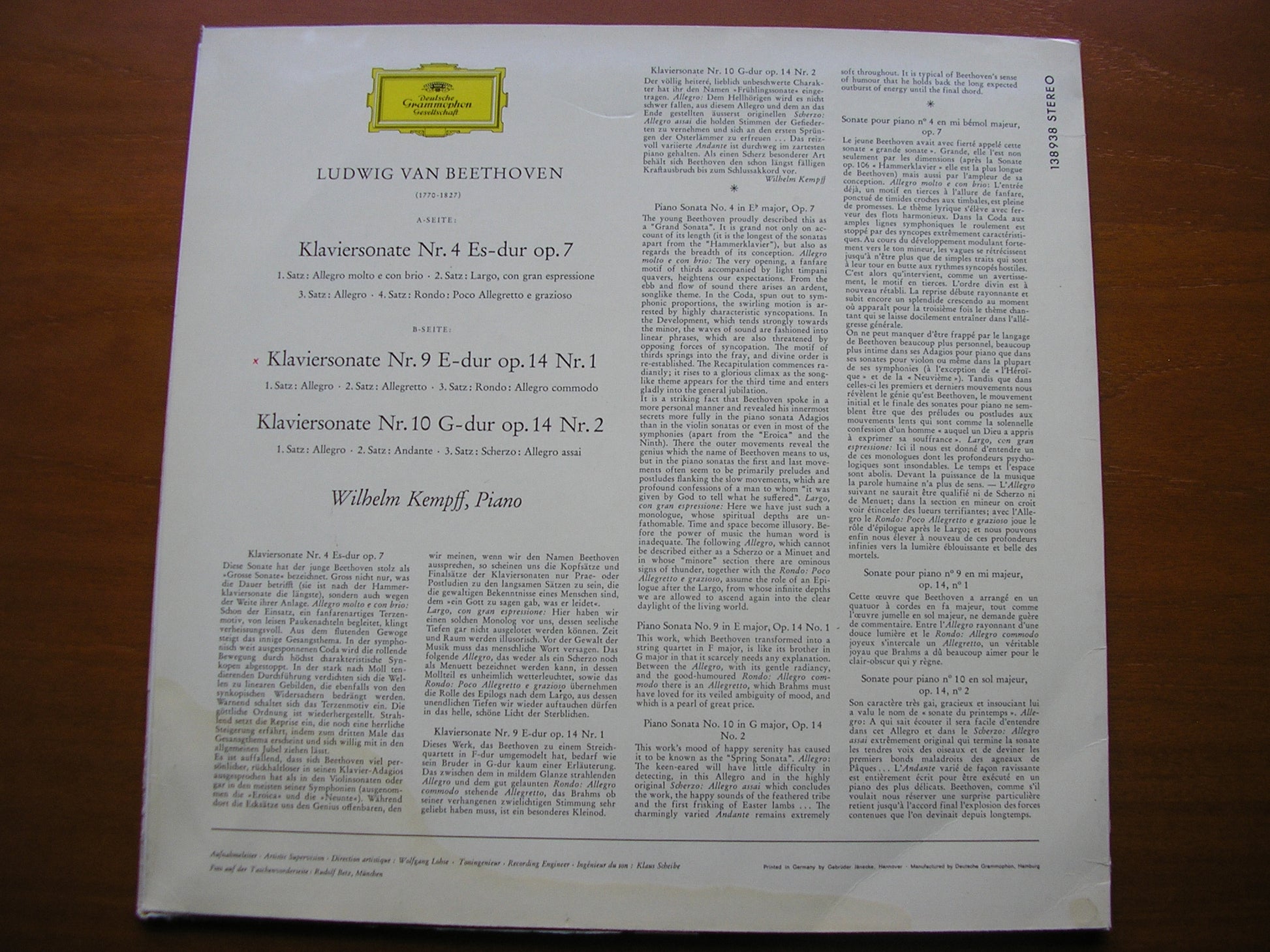 138 938  BEETHOVEN: PIANO SOATAS Nos. 4 / 9 / 10       WILHELM KEMPFF