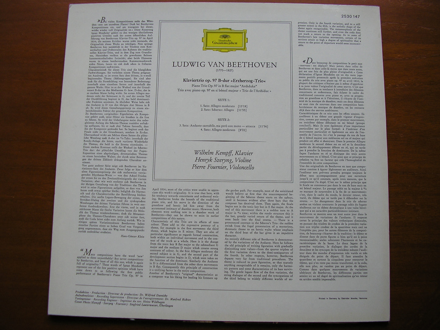 BEETHOVEN: PIANO TRIO No. 7 in B Op. 97 'Archduke' KEMPFF / SZERYNG / FOURNIER 2530 147