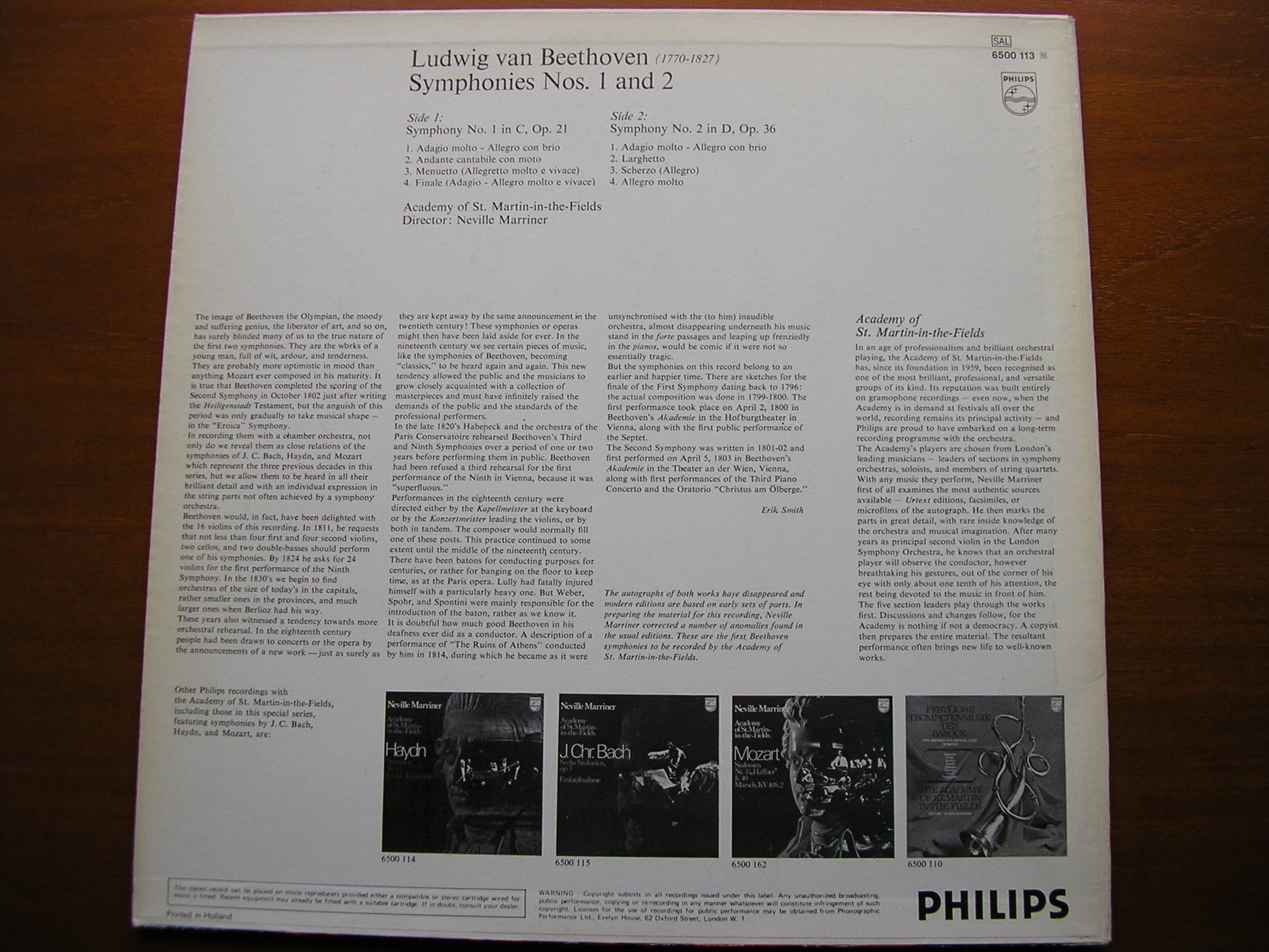 6500 113  BEETHOVEN: SYMPHONIES Nos. 1 & 2    NEVILLE MARRINER / ACADEMY OF ST MARTIN IN THE FIELDS