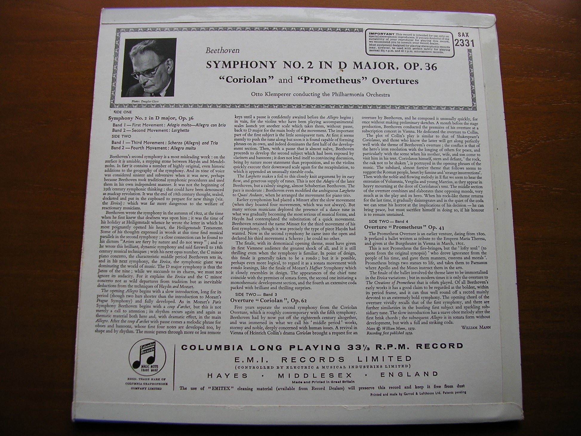SAX 2331  BEETHOVEN: SYMPHONY No. 2 / OVERTURES Coriolan / Prometheus   OTTO KLEMPERER / PHILHARMONIA ORCHESTRA