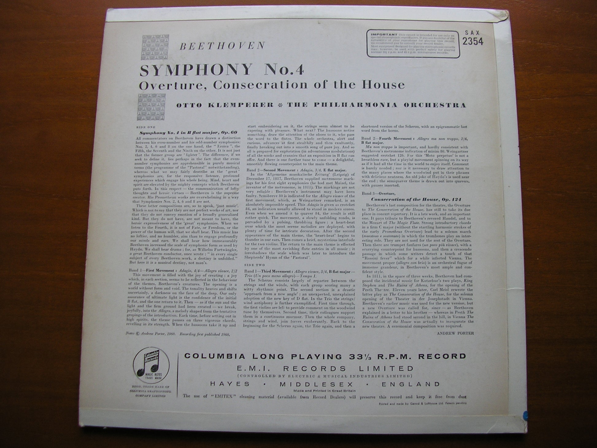 SAX 2354 BEETHOVEN: SYMPHONY No. 4 / OVERTURE Consecration of the House OTTO KLEMPERER / PHILHARMONIA