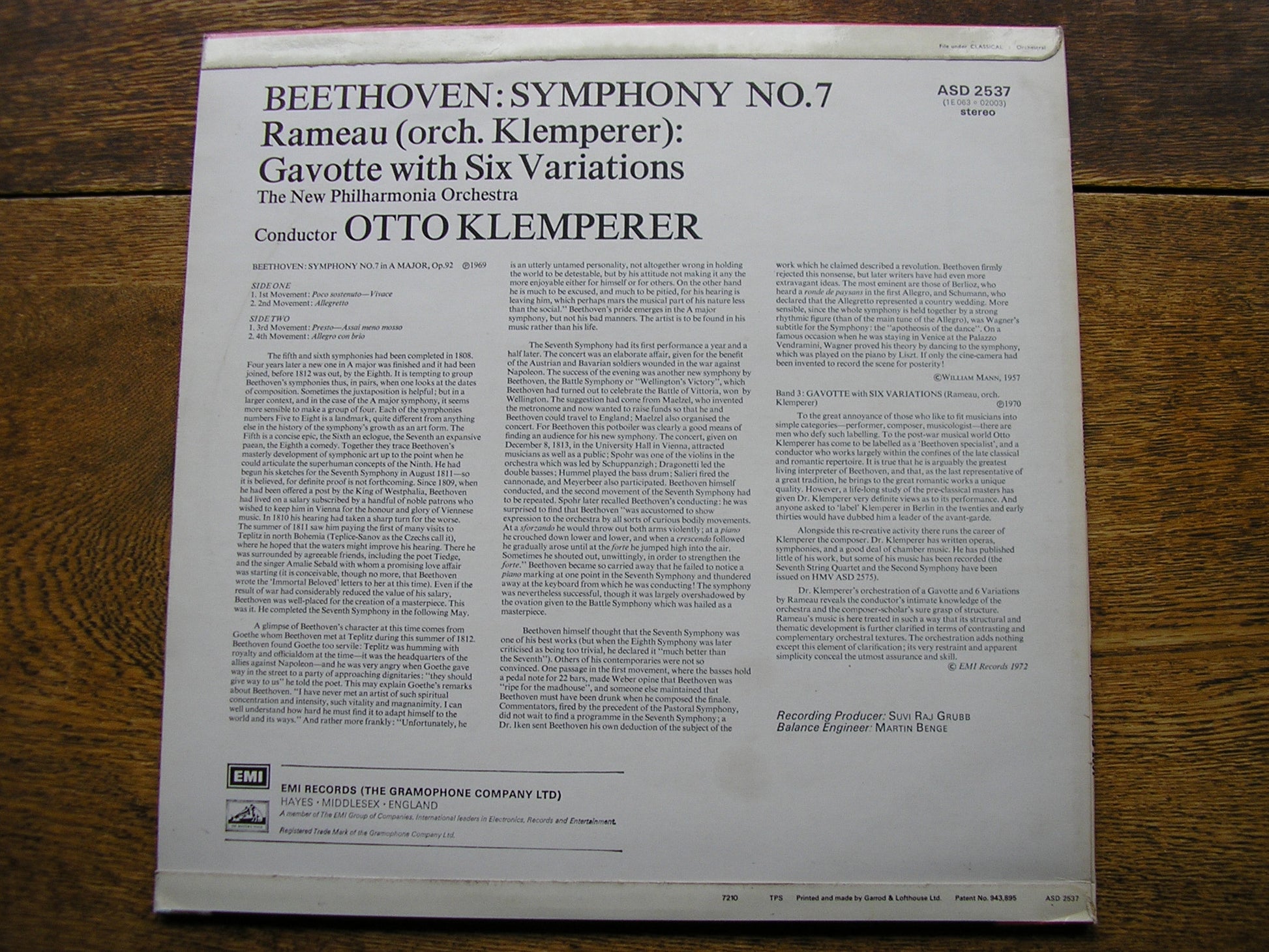 ASD 2537  BEETHOVEN: SYMPHONY no. 7 / KLEMPERER: RAMEAU VARIATIONS   OTTO KLEMPERER / NEW PHILHARMONIA ORCHESTRA
