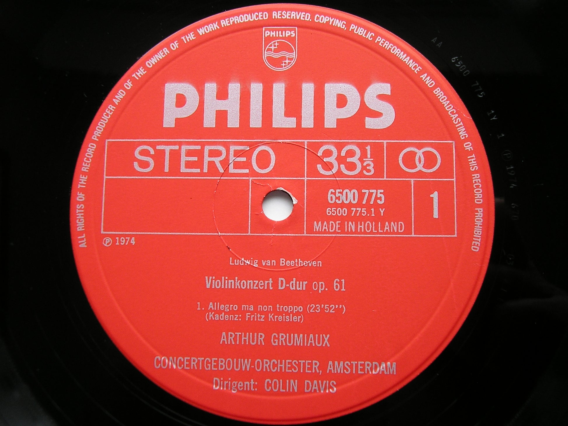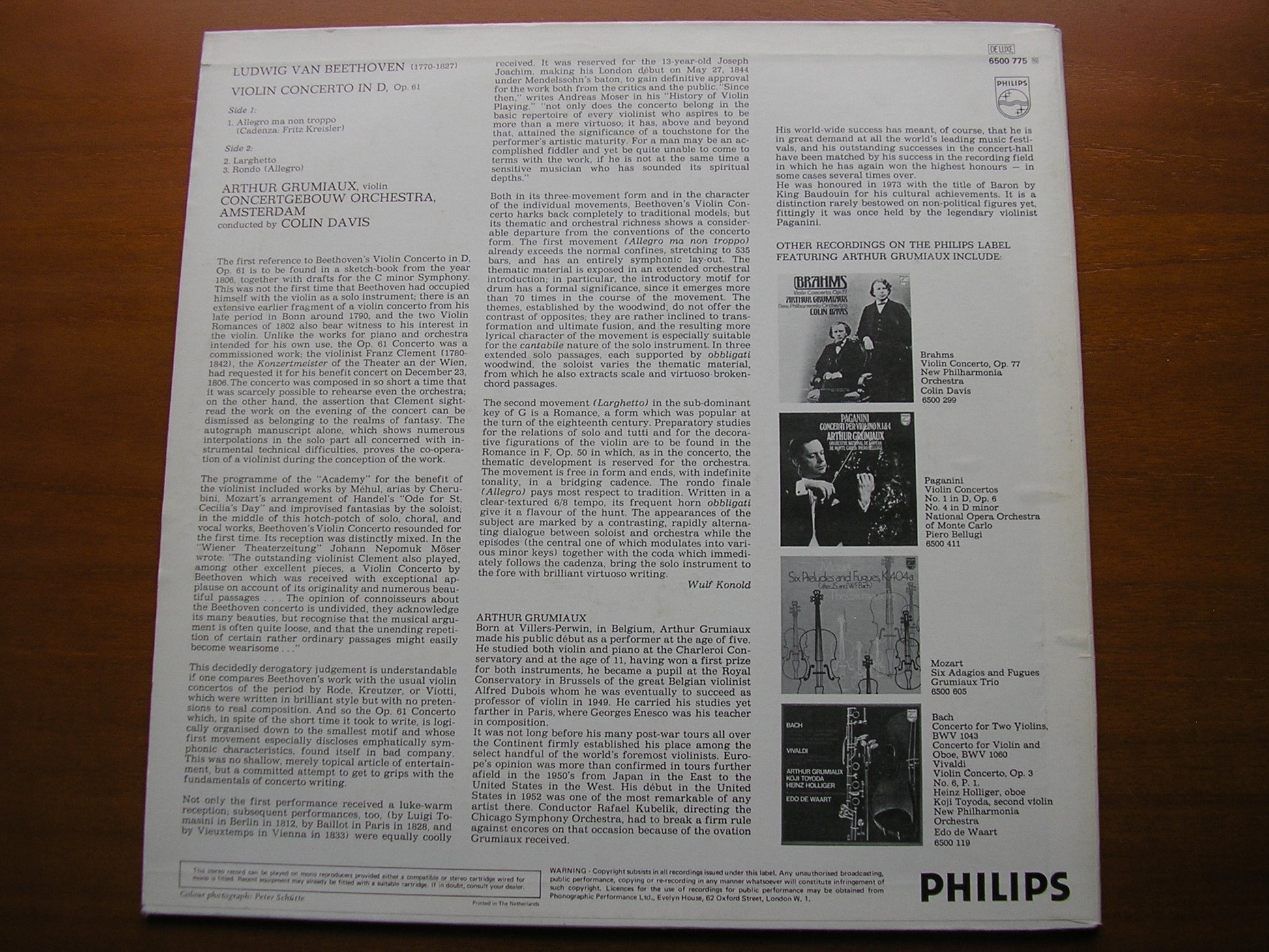 6500 775  BEETHOVEN: VIOLIN CONCERTO    ARTHR GRUMIAUX / CONCERTGEBOUW ORCHESTRA AMSTERDAM / COLIN DAVIS