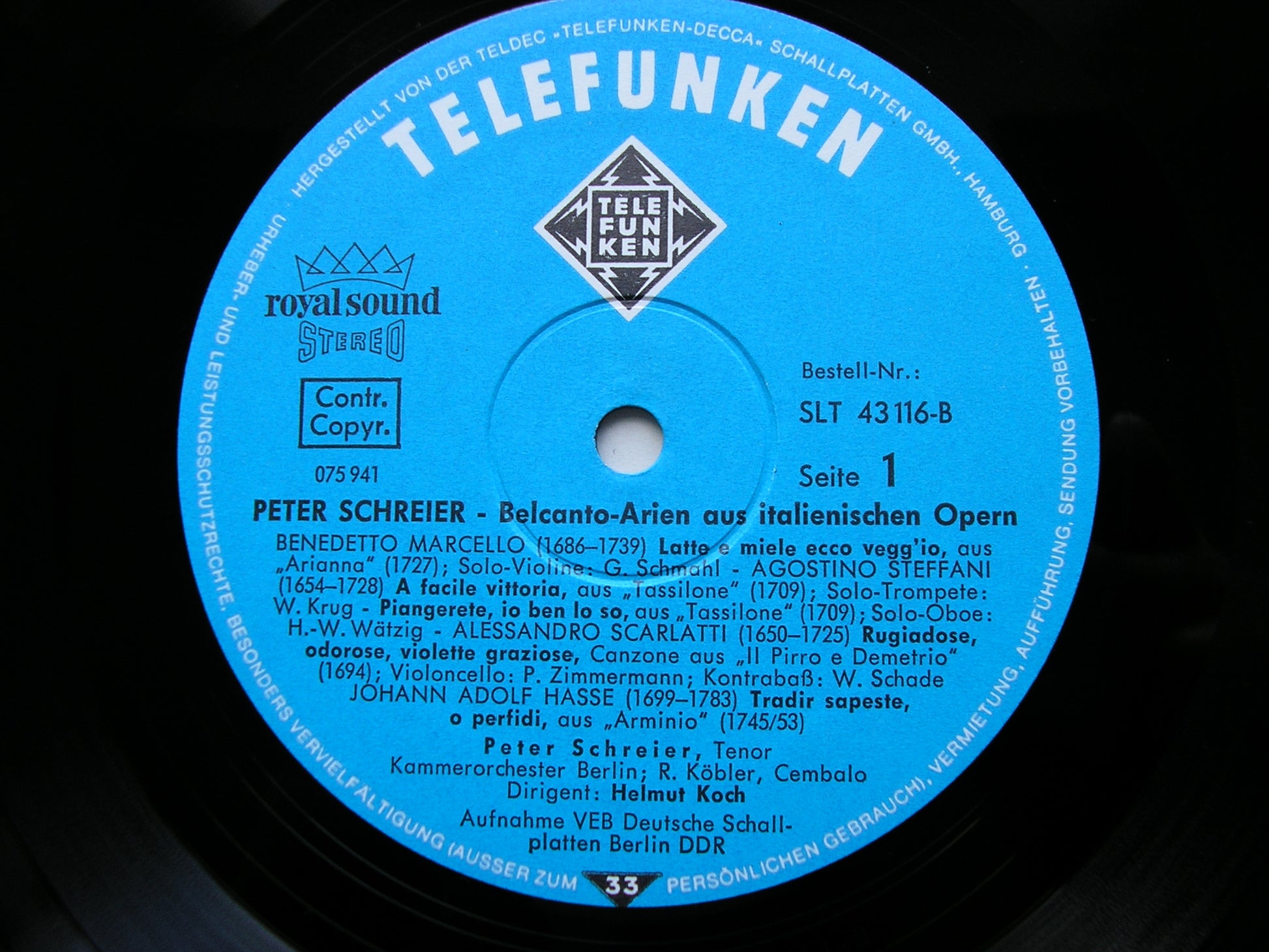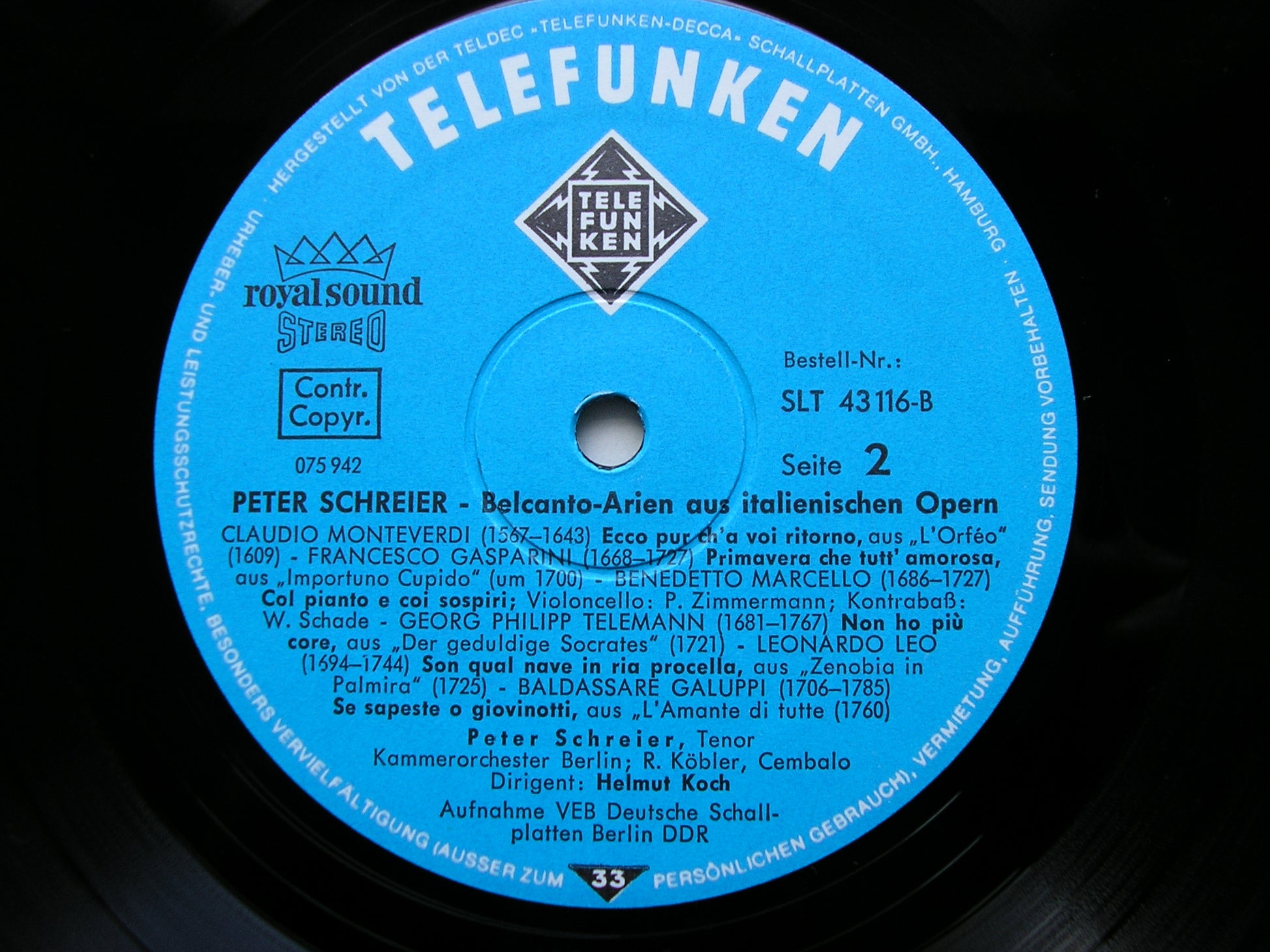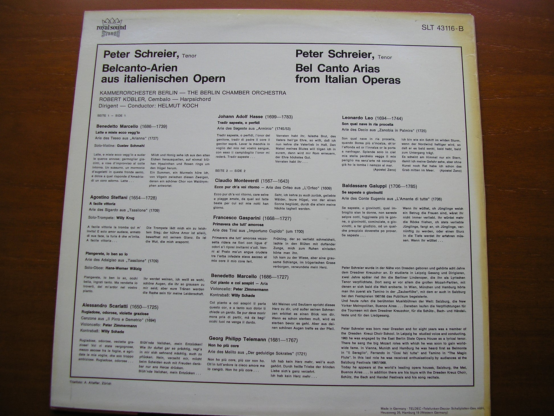 SLT 43116  ITALIAN ARIAS: STEFFANI / MONTEVERDI / GALUPPI / HASSE / SCARLATTI / LEO / TELEMANN     PETER SCHREIER / BERLIN CHAMBER ORCHESTRA / HELMUT KOCH