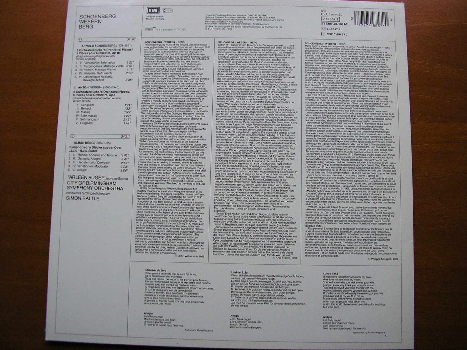 7 49857  BERG: LULU SUITE / WEBERN: SIX ORCHESTRAL PIECES Op. 6 / SCHOENBERG: FIVE ORCHESTRAL PIECES Op. 16       ARLEEN AUGER / CITY OF BIRMINGHAM SYMPHONY ORCHESTRA / SIMON RATTLE