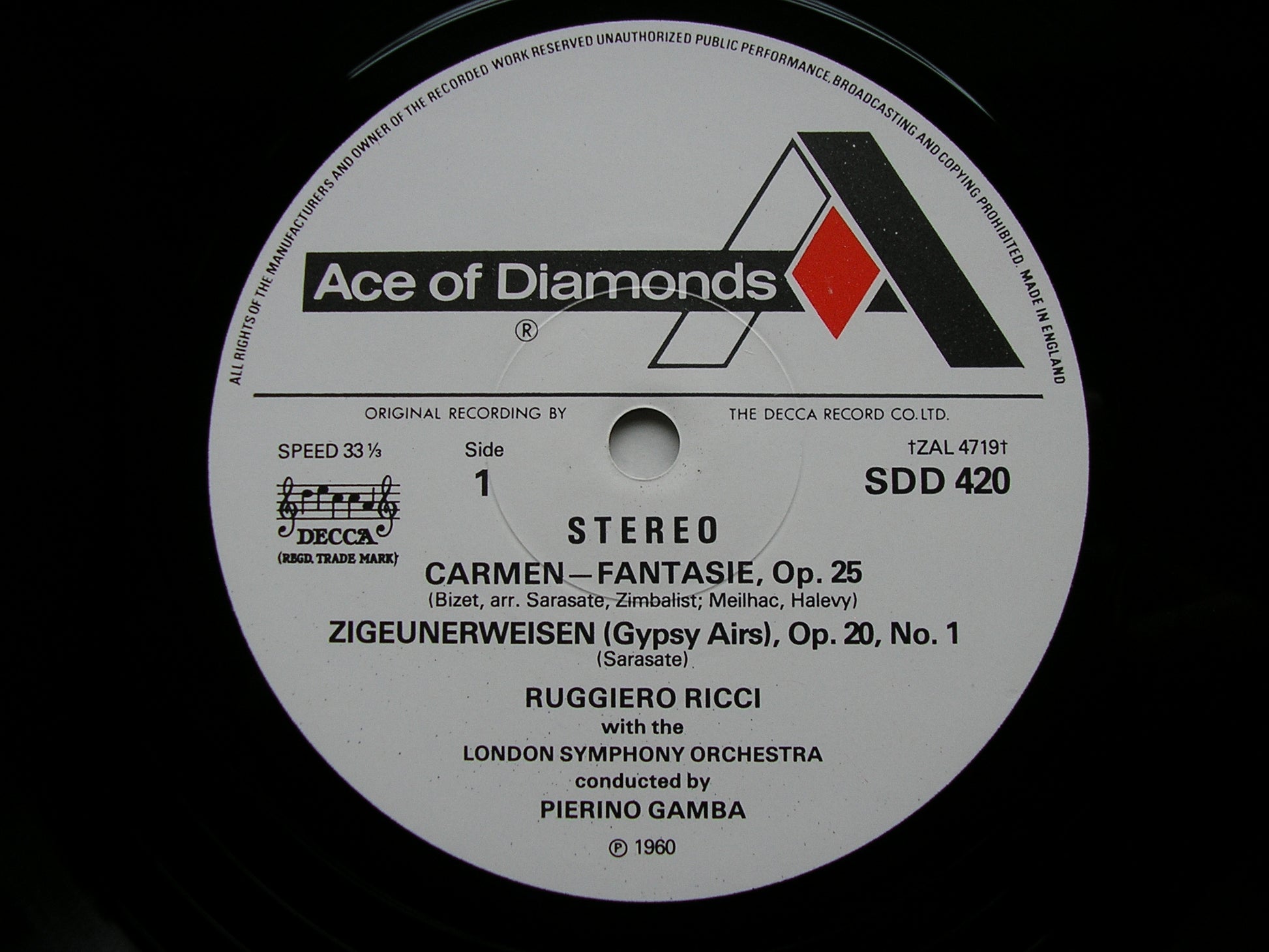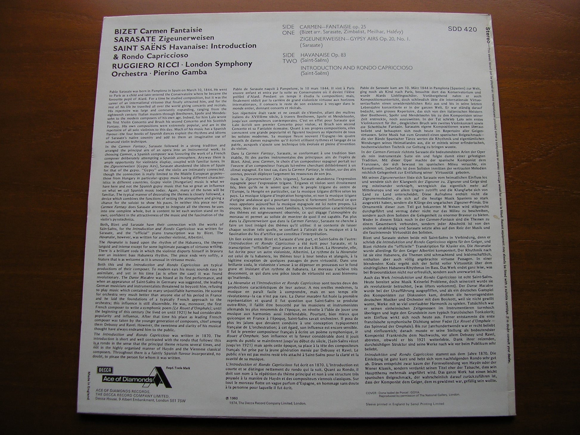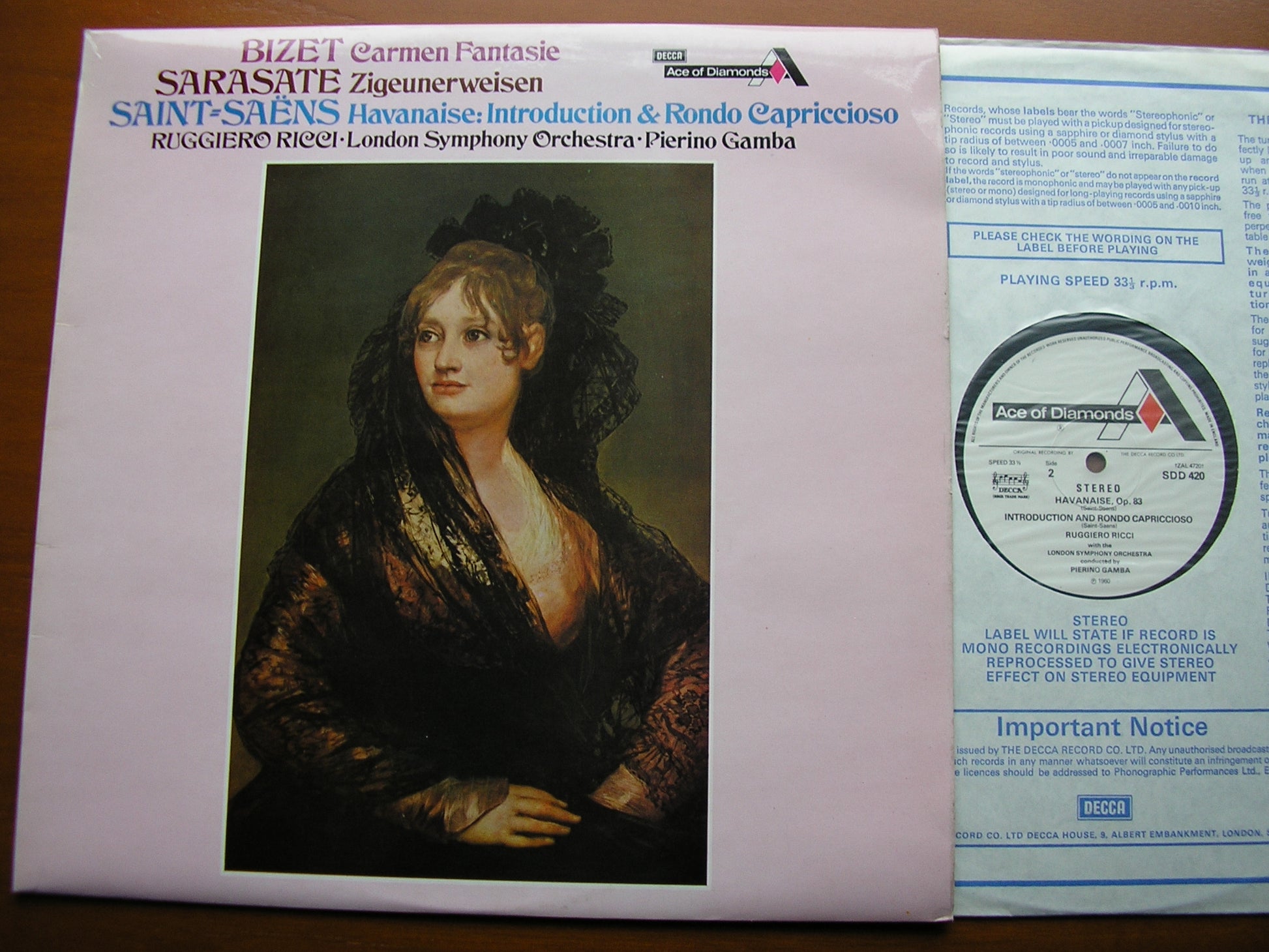 SDD 420  BIZET-SARASATE: CARMEN FANTAISIE / SAINT-SAENS: HAVANAISE / INTRODUCTION & RONDO CAPRICCIOSO / SARASATE: ZIGEUNERWEISEN  RUGGIERO RICCI / LONDON SYMPHONY ORCHESTRA / PIERINO GAMBA