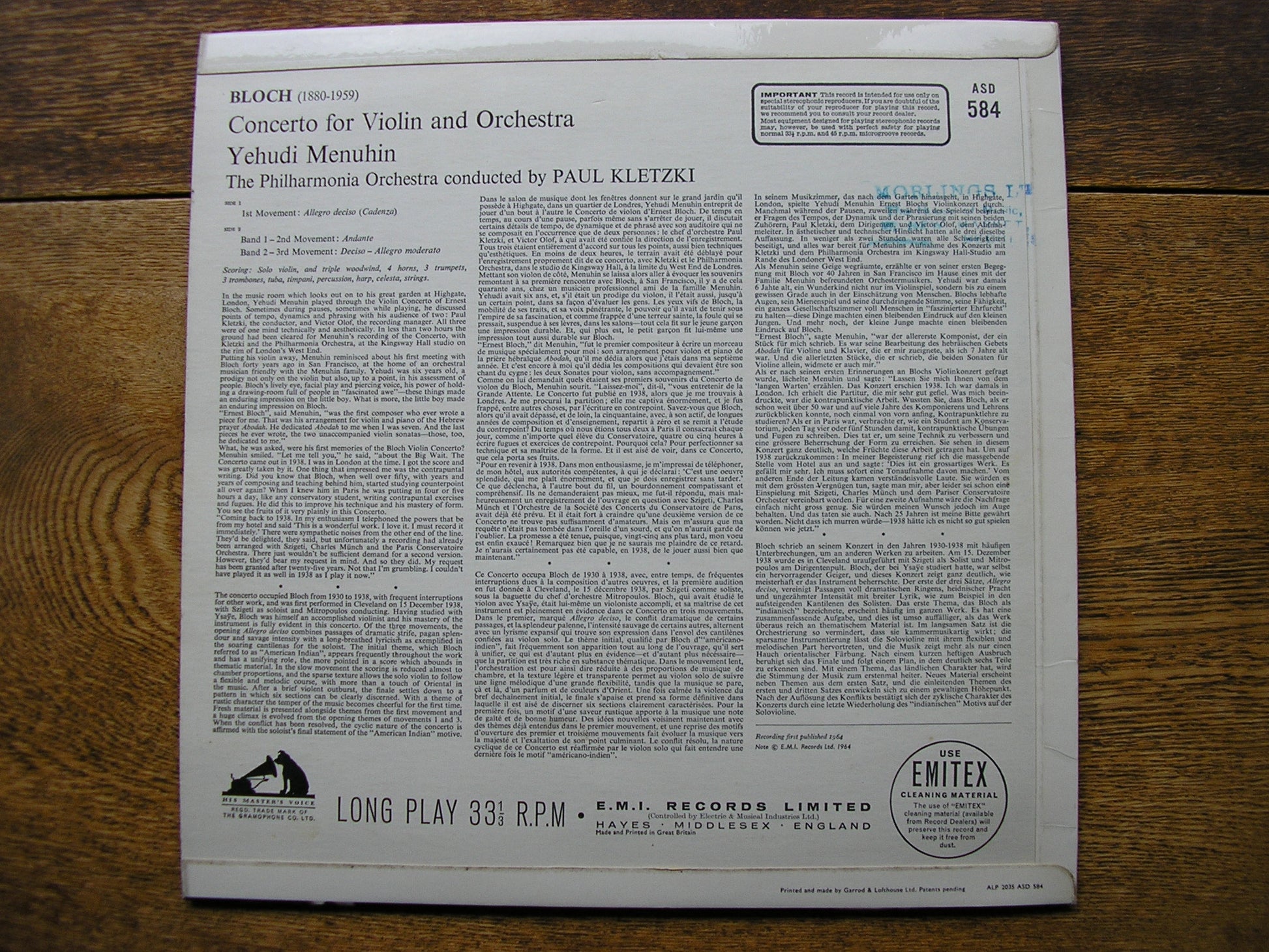 ASD 584  BLOCH: VIOLIN CONCERTO  YEHUDI MENUHIN / PHILHARMONIA ORCHESTRA / PAUL KLETZKI