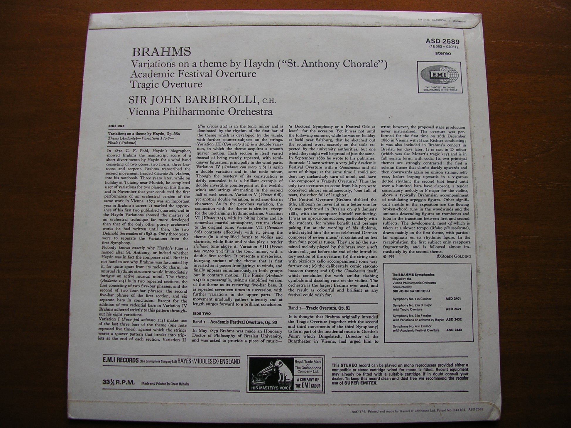 ASD 2589  BRAHMS: HAYDN VARIATIONS / ACADEMIC FESTIVAL & TRAGIC OVERTURES    SIR JOHN BARBIROLLI / VIENNA PHILHARMONIC ORCHESTRA