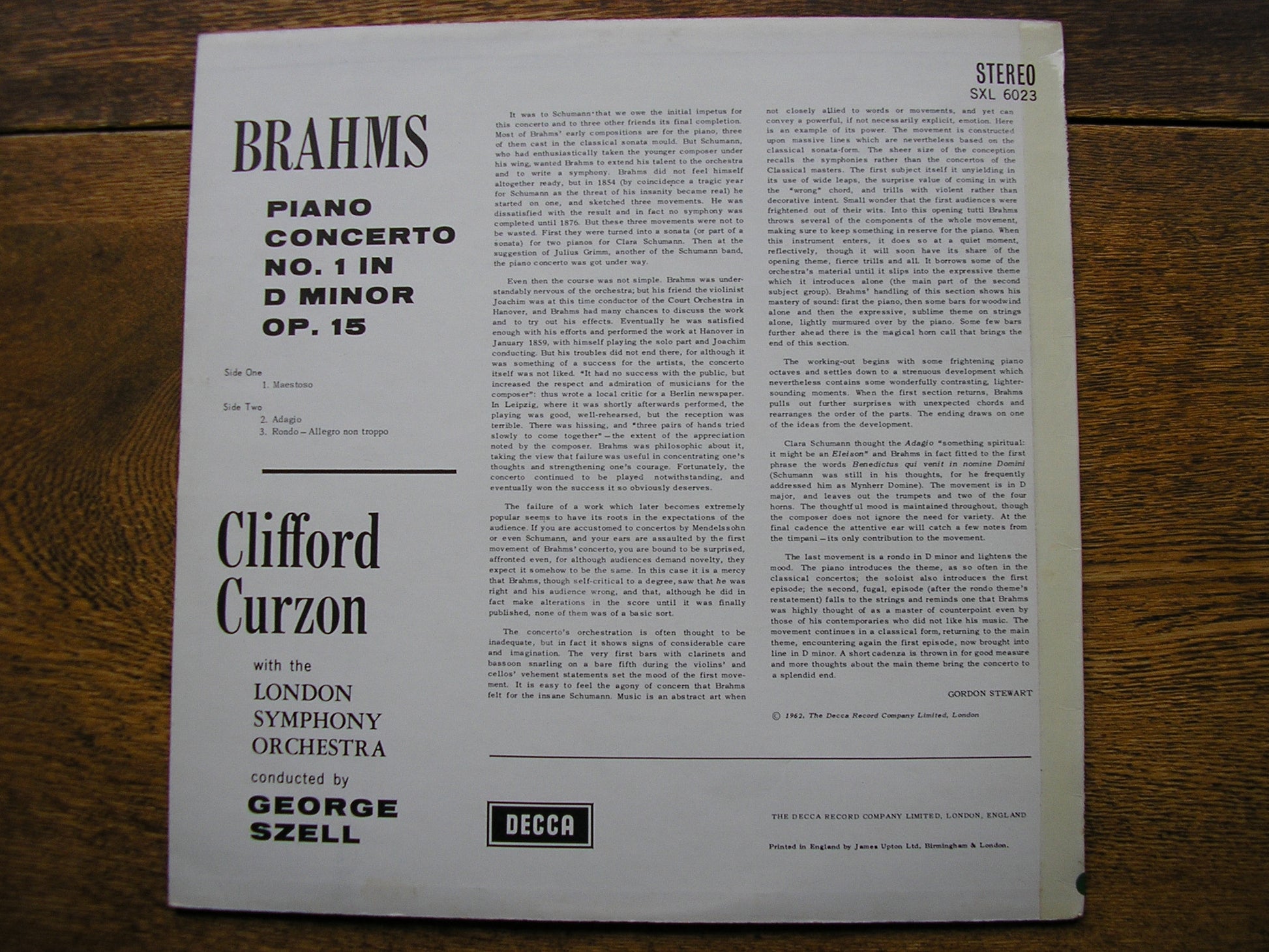 SXL 6023  BRAHMS: PIANO CONCERTO No. 1  CLIFFORD CURZON / LONDON SYMPHONY ORCHESTRA / GEORGE SZELL