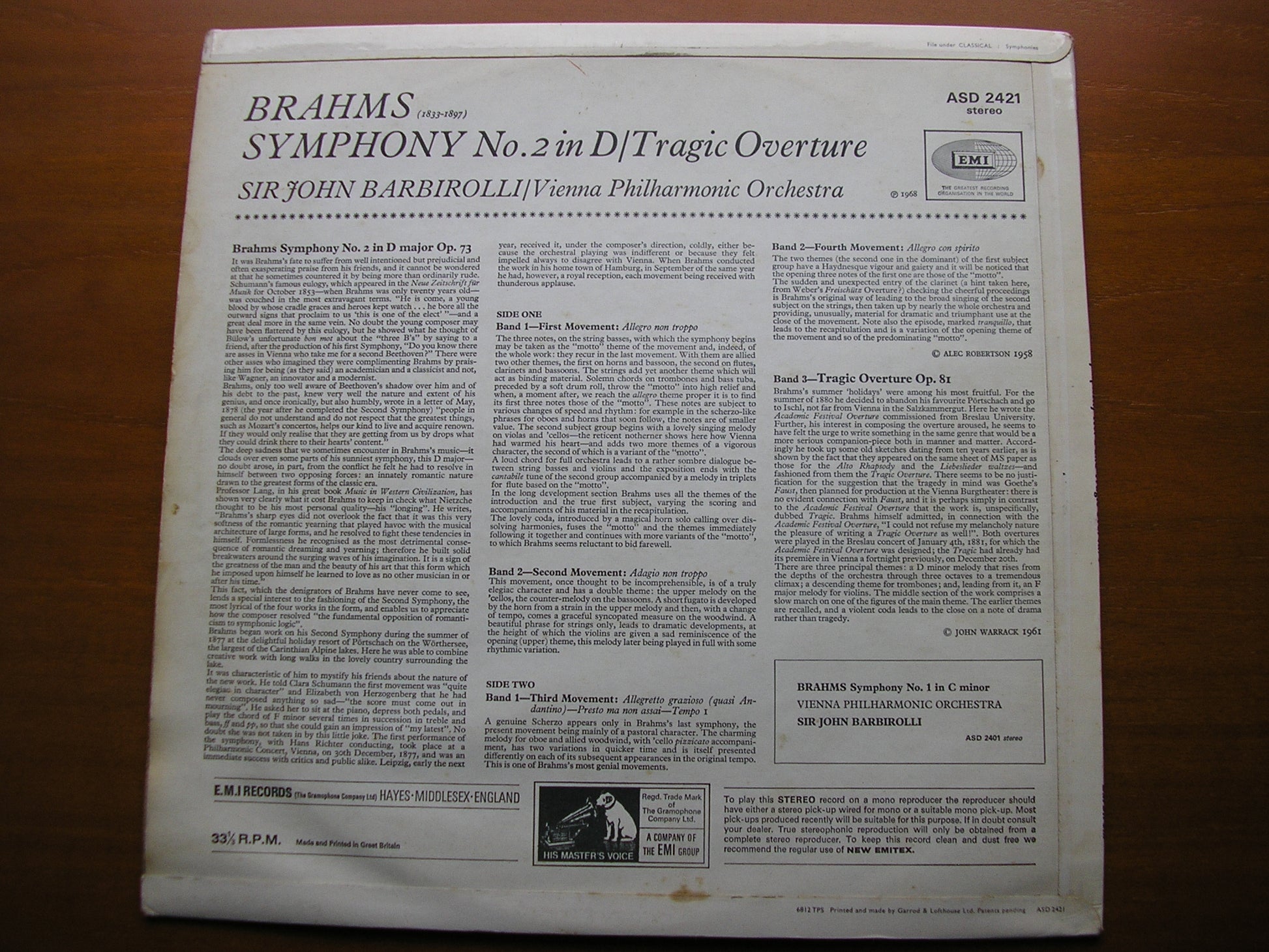 ASD 2421  BRAHMS: SYMPHONY No. 2 / TRAGIC OVERTURE    SIR JOHN BARBIROLLI / VIENNA PHILHARMONIC ORCHESTRA