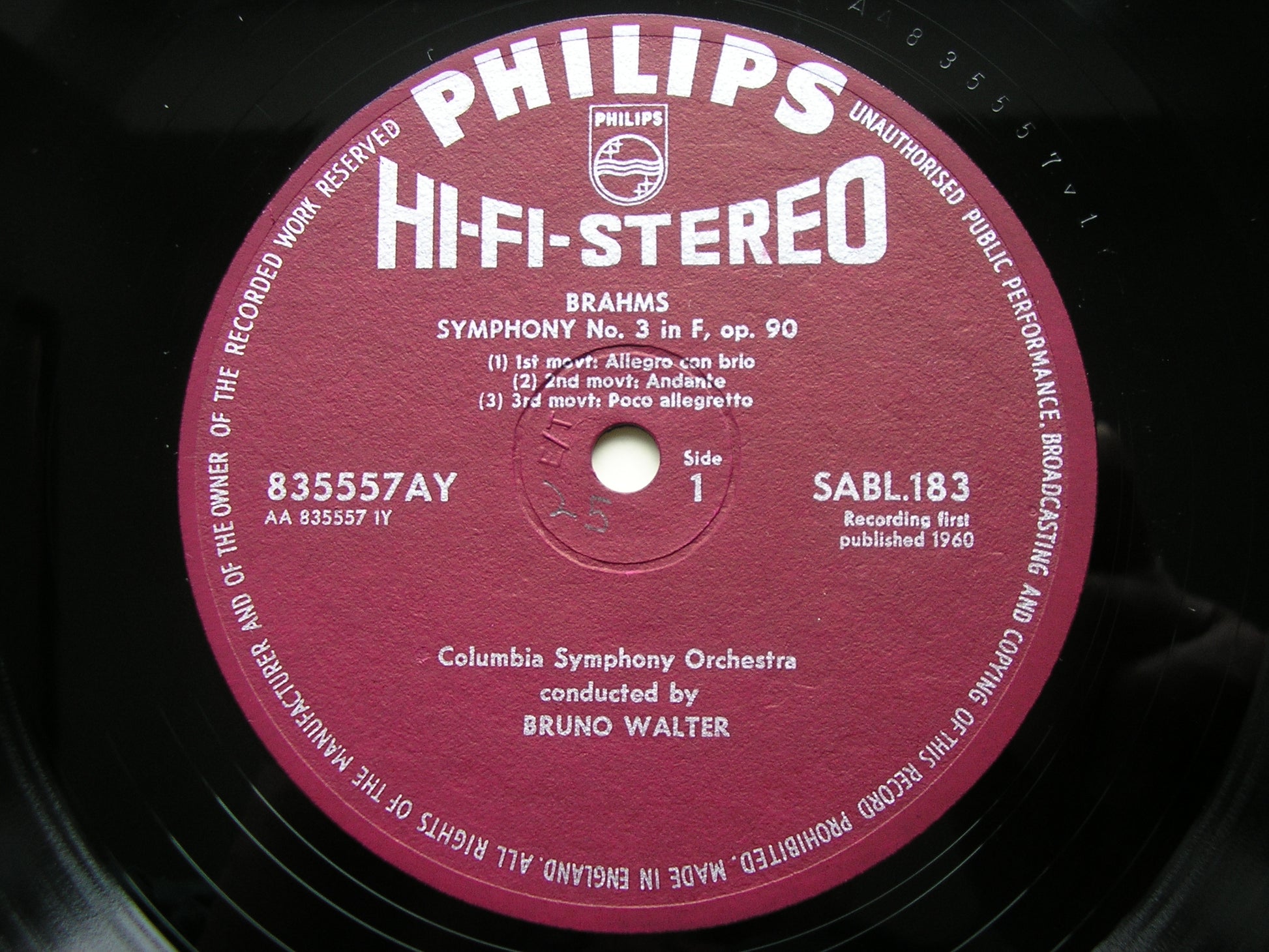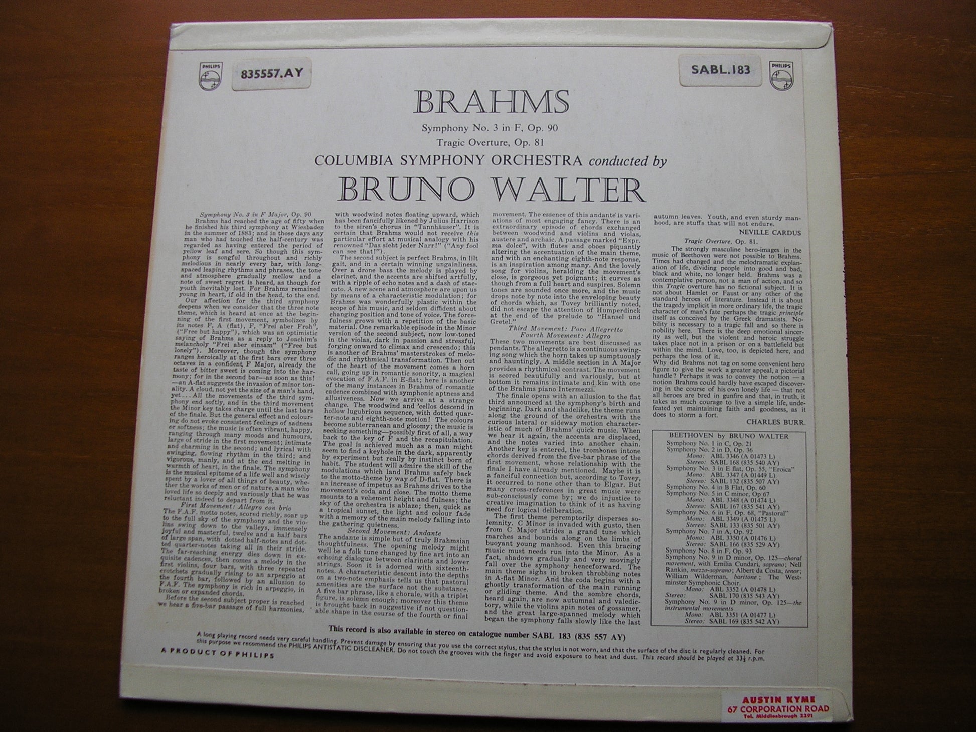 BRAHMS: SYMPHONY No. 3 / TRAGIC OVERTURE BRUNO WALTER / COLUMBIA SYMPHONY SABL 183