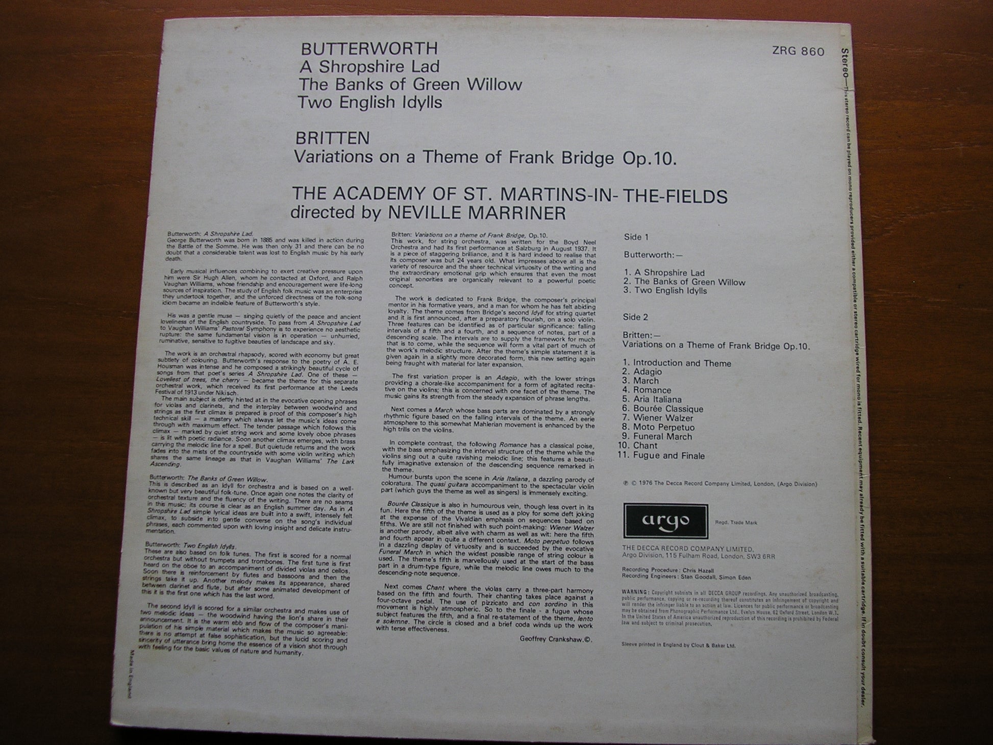 ZRG 860  BRITTEN: VARIATIONS ON A THEME OF FRANK BRIDGE / BUTTERWORTH: THE BANKS OF GREEN WILLOW / TWO ENGLISH IDYLLS / A SHROPSHIRE LAD    NEVILLE MARRINER / ACADEMY OF ST MARTIN IN THE FIELDS