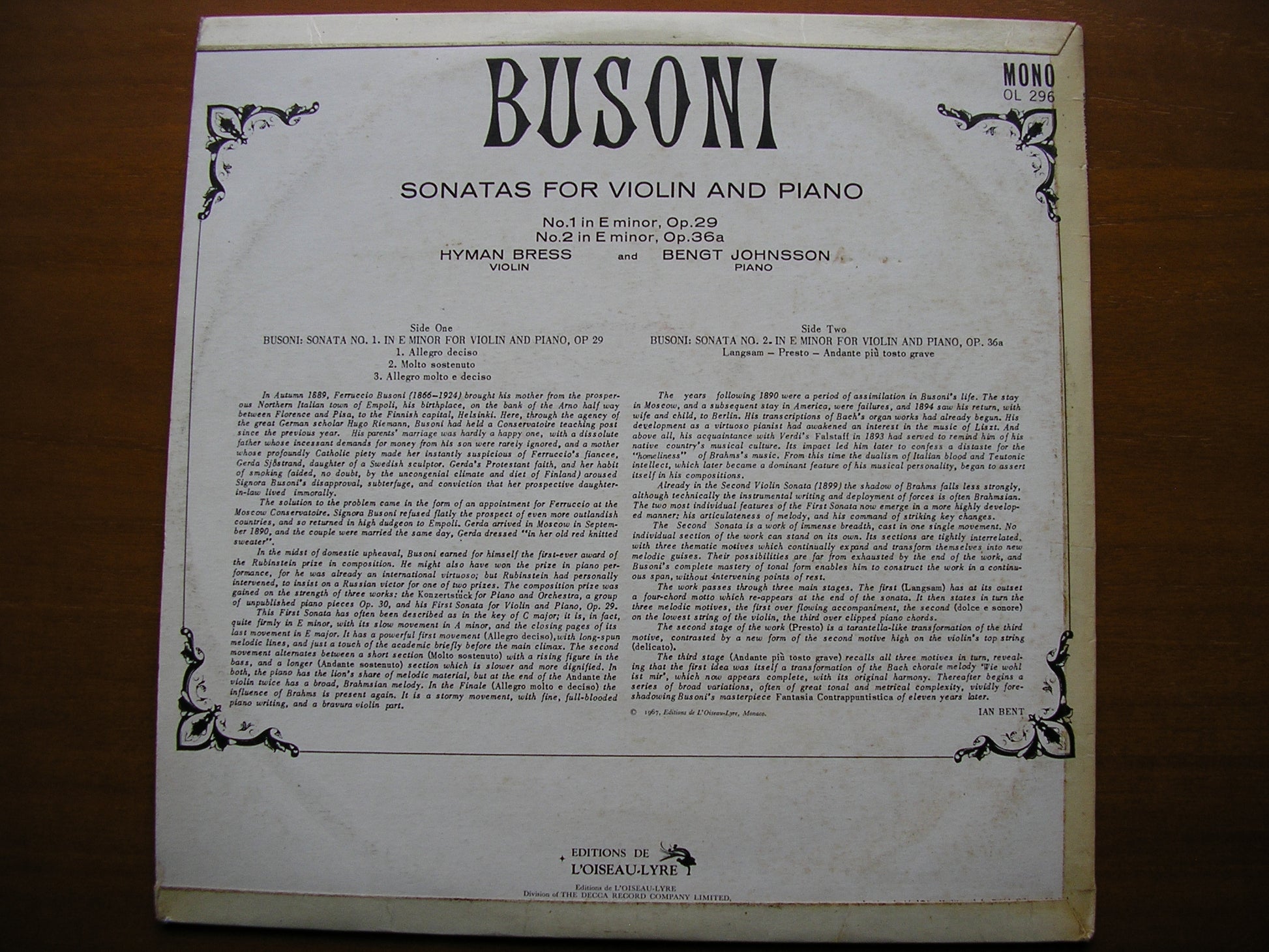 OL 296  BUSONI: VIOLIN SONATAS No. 1 in E  Op. 29  &  No. 2 in E  Op. 36a       HYMAN BRESS / BENGT JOHNSSON