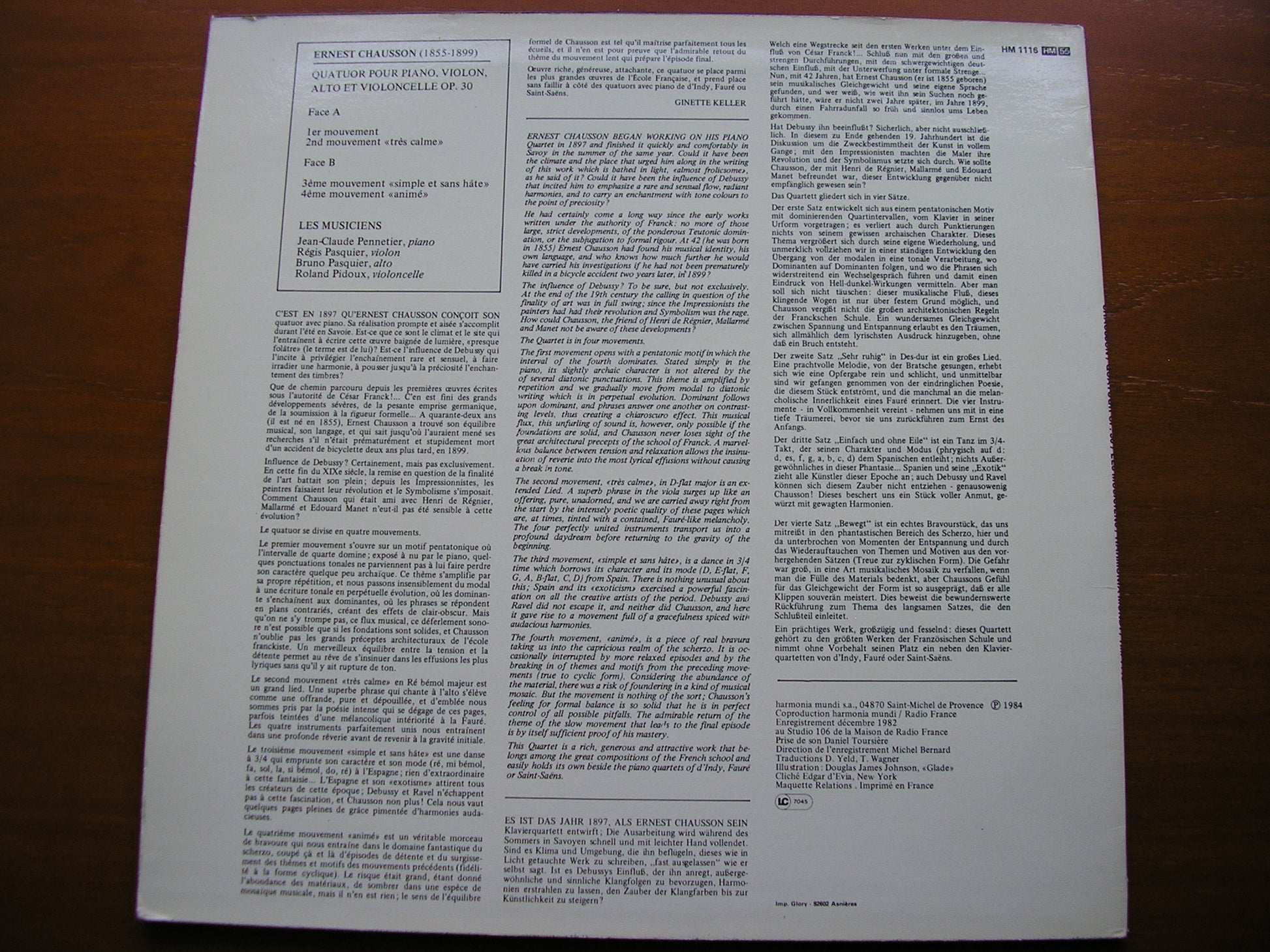 HM 1116  CHAUSSON: PIANO QUARTET Op. 30   LES MUSICIENS - REGIS PASQUIER / ROLAND PIDOUX / JEAN-CLAUDE PENNETIER / BRUNO PASQUIER