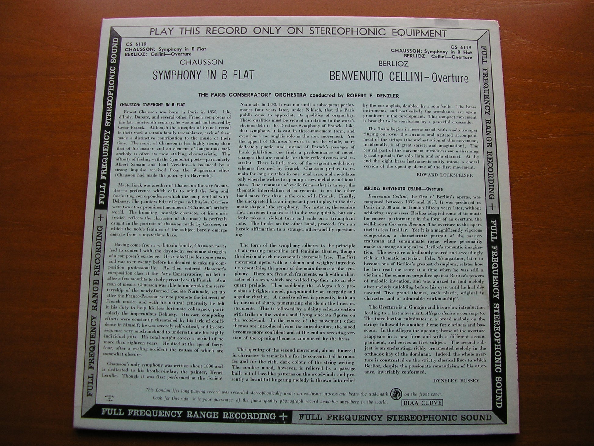 CS 6119  CHAUSSON: SYMPHONY / BERLIOZ: OVERTURE Benvenuto Cellini     ROBERT DENZLER / PARIS CONSERVATOIRE ORCHESTRA