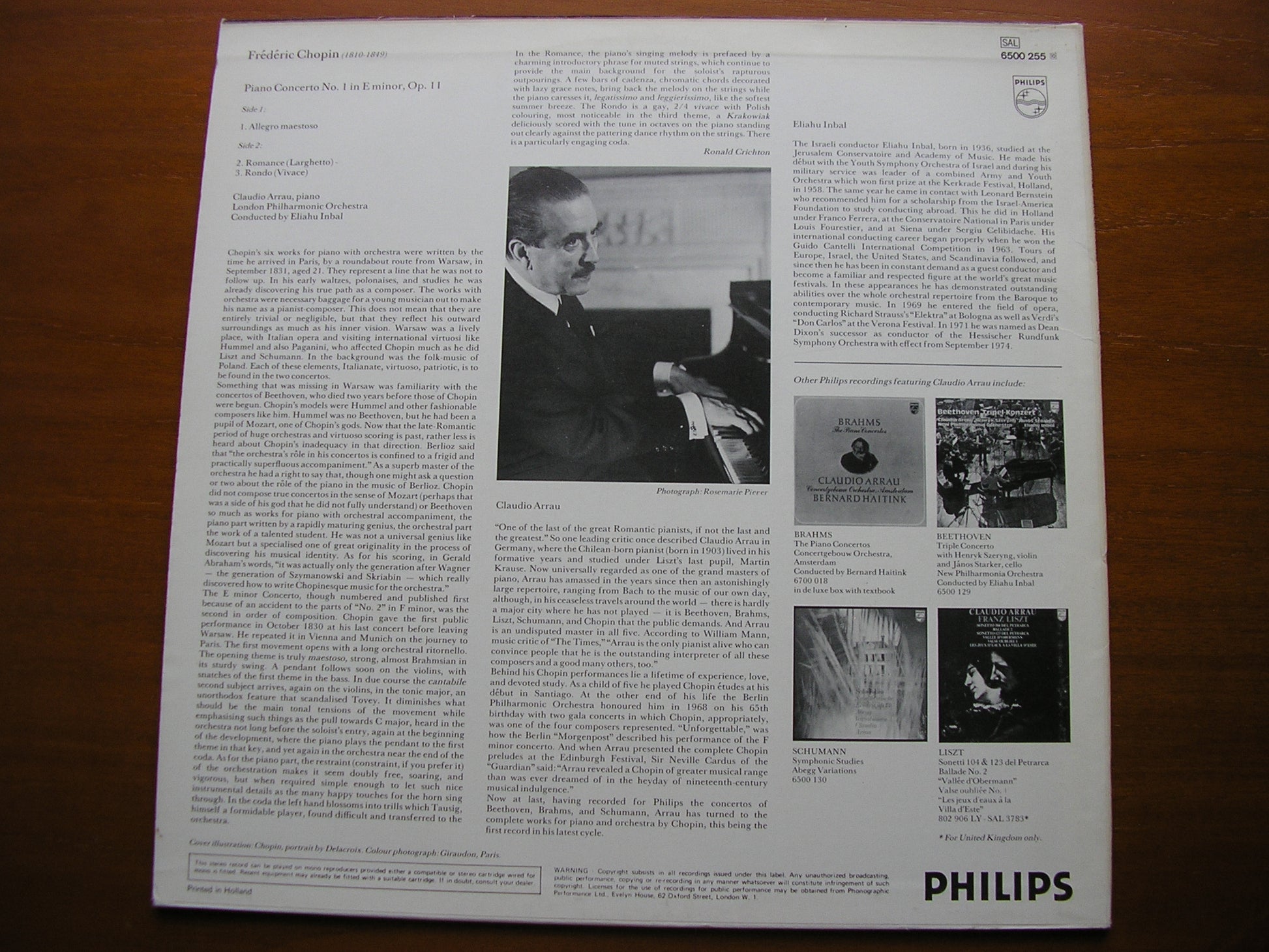6500 255 / 6500 309  CHOPIN: PIANO CONCERTOS Nos. 1 & 2 / KRAKOWIAK Op. 14   CLAUDIO ARRAU / LONDON PHILHARMONIC ORCHESTRA / ELIAHU INBAL