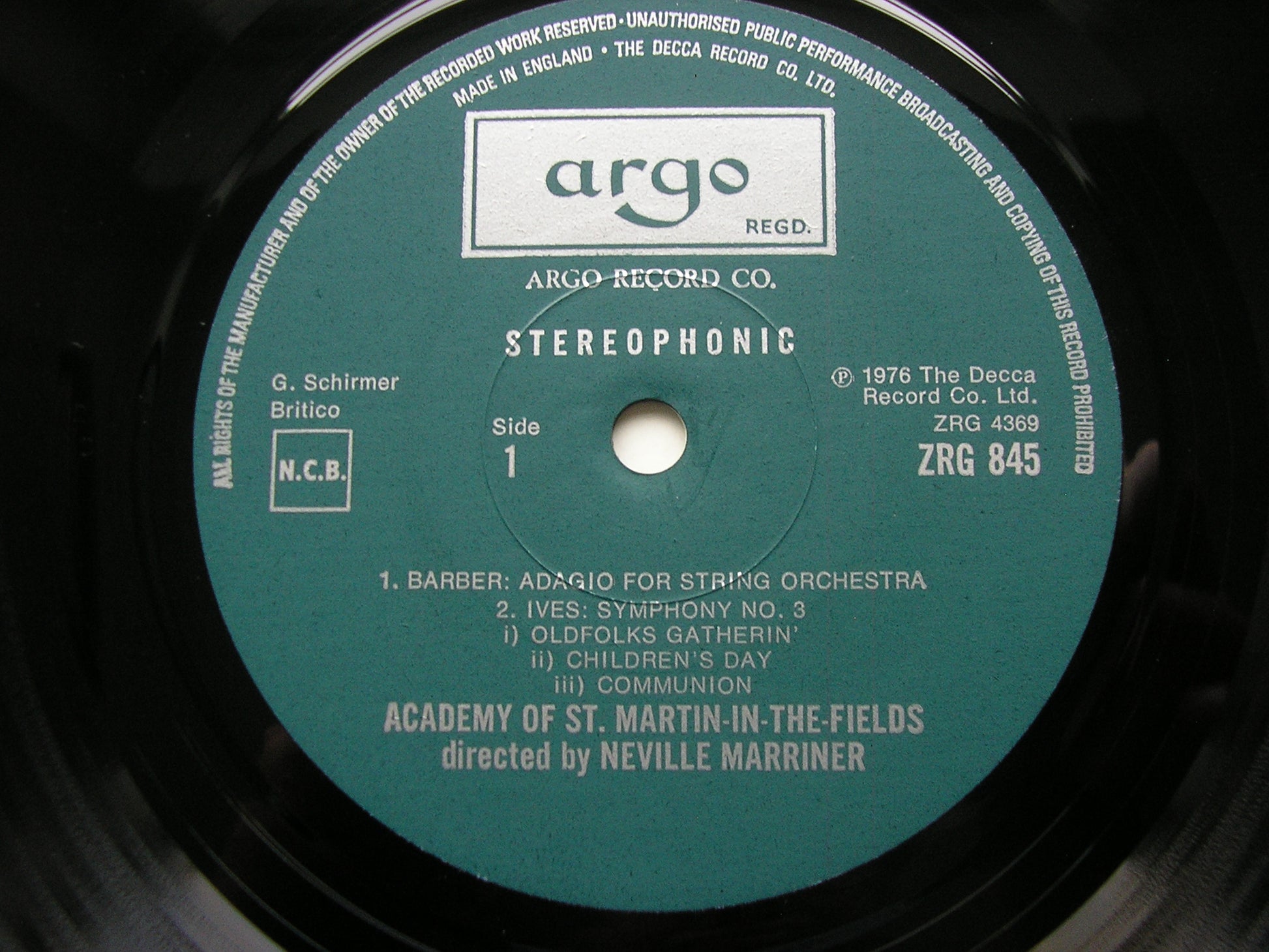 COPLAND: QUIET CITY / BARBER: ADAGIO / IVES: SYMPHONY No. 3 MARRINER / ACADEMY OF ST. MARTIN IN THE FIELDS ZRG 845
