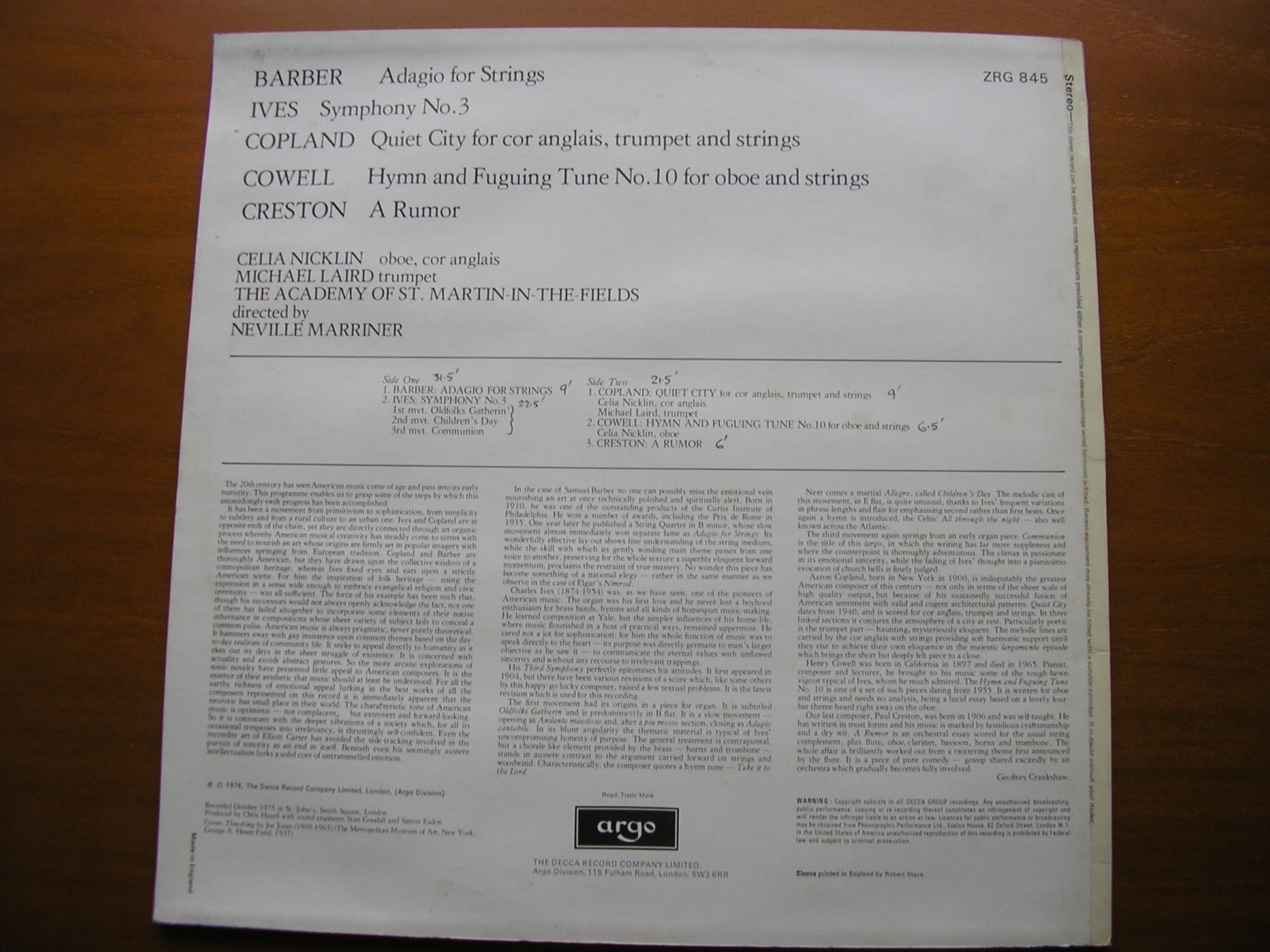 ZRG 845  COPLAND: QUIET CITY / BARBER: ADAGIO / IVES: SYMPHONY No. 3 / CRESTON: A RUMOR      NEVILLE MARRINER / ACADEMY OF ST MARTIN IN THE FIELDS