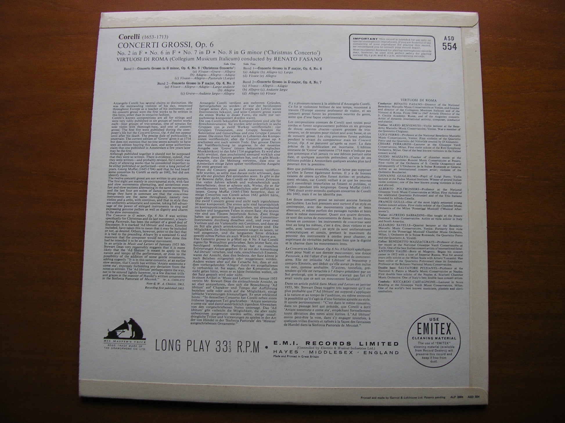 ASD 554  CORELLI: FOUR CONCERTI GROSSI Op. 6      VIRTUOSI DI ROMA / RENATO FASANO