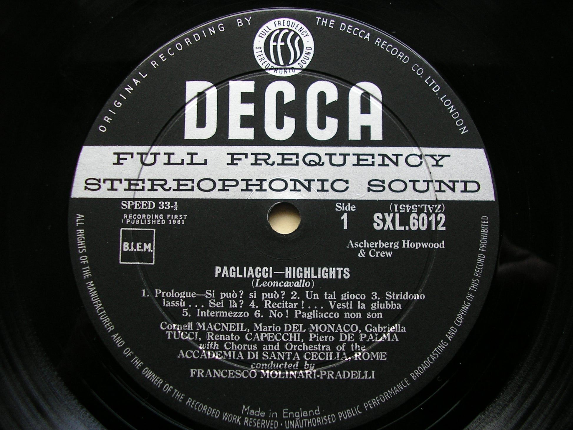 SXL 6012  LEONCAVALLO: PAGLIACCI  / MASCAGNI: CAVALLERIA RUSTICANA  highlights   MARIO DEL MONACO / GIULIETTA SIMIONATO / GABRIELLA TUCCI / CORNELL MACNEIL / ACCADEMICA DI SANTA CECILIA / TULLIO SERAFIN / FRANCESCO MOLINARI-PRADELLI