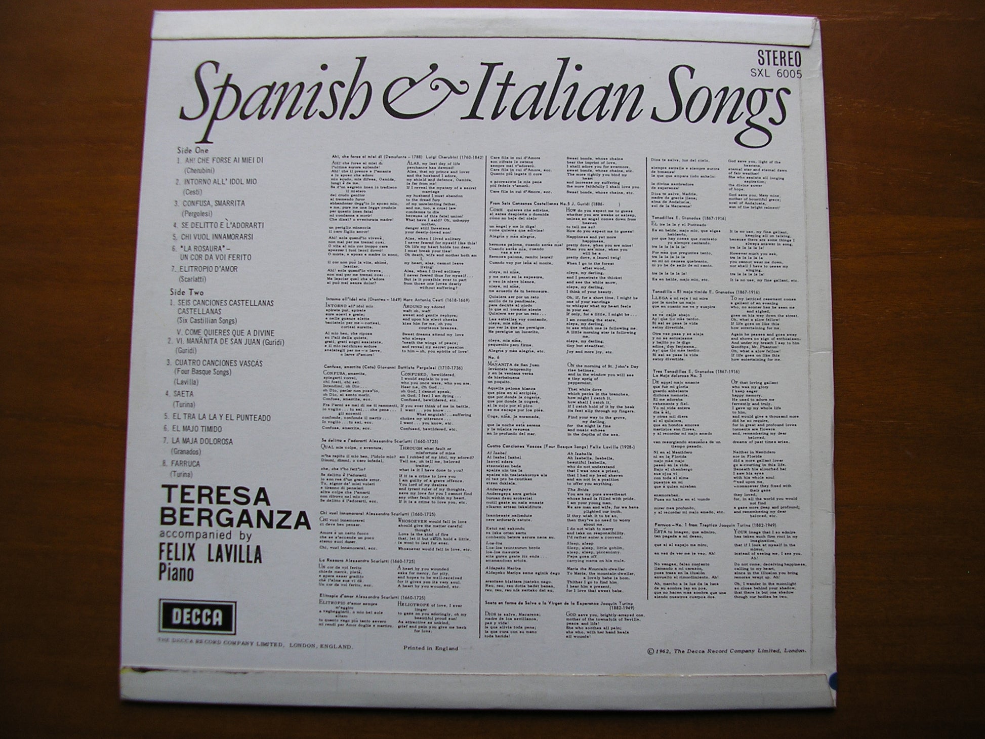 SXL 6005:  TERESA BERGANZA SINGS SPANISH & ITALIAN SONGS     TERESA BERGANZA / FELIX LAVILLA