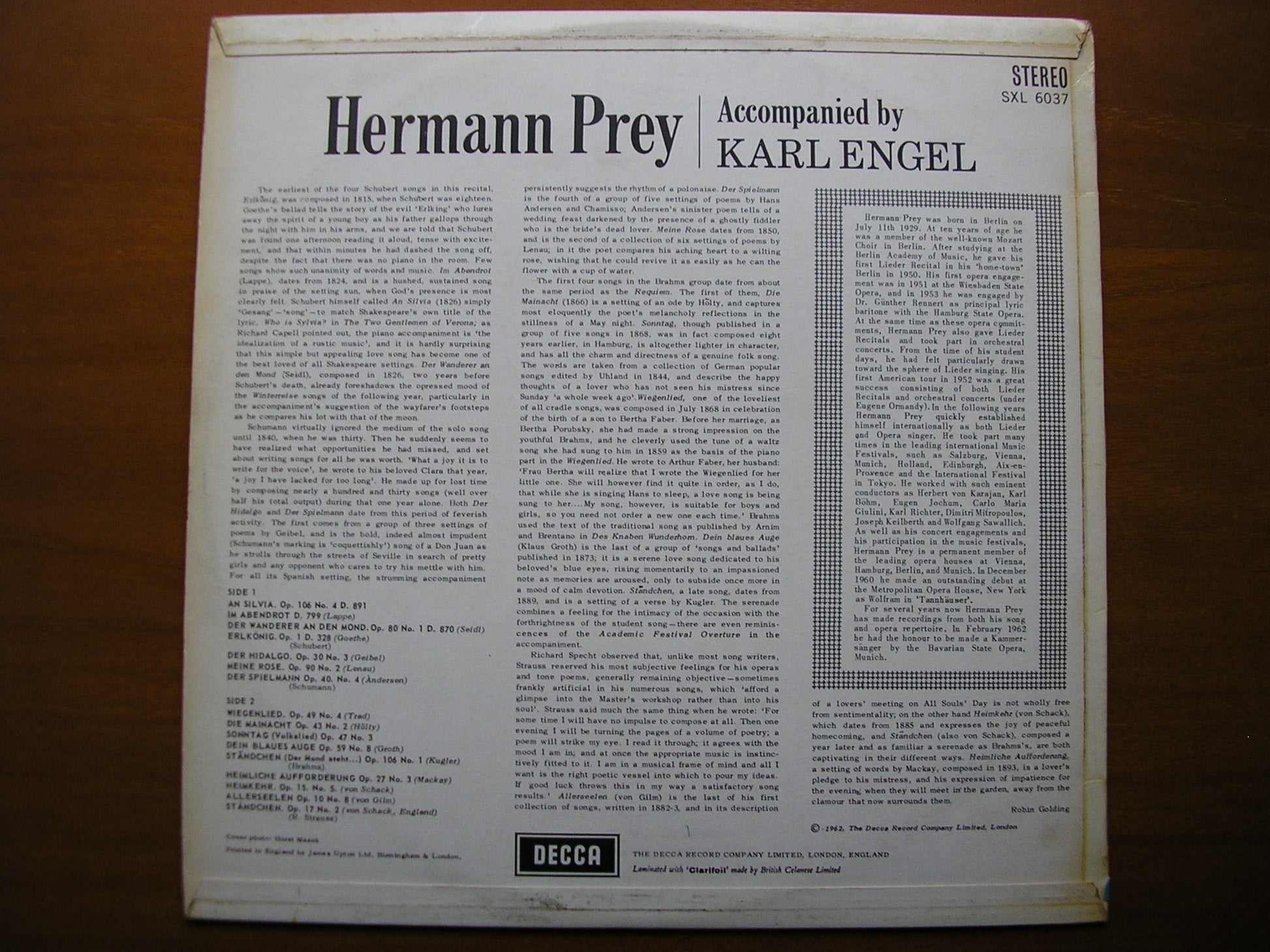 SXL 6037  BRAHMS / STRAUSS / SCHUMANN / SCHUBERT: SONGS      HERMANN PREY / KARL ENGEL