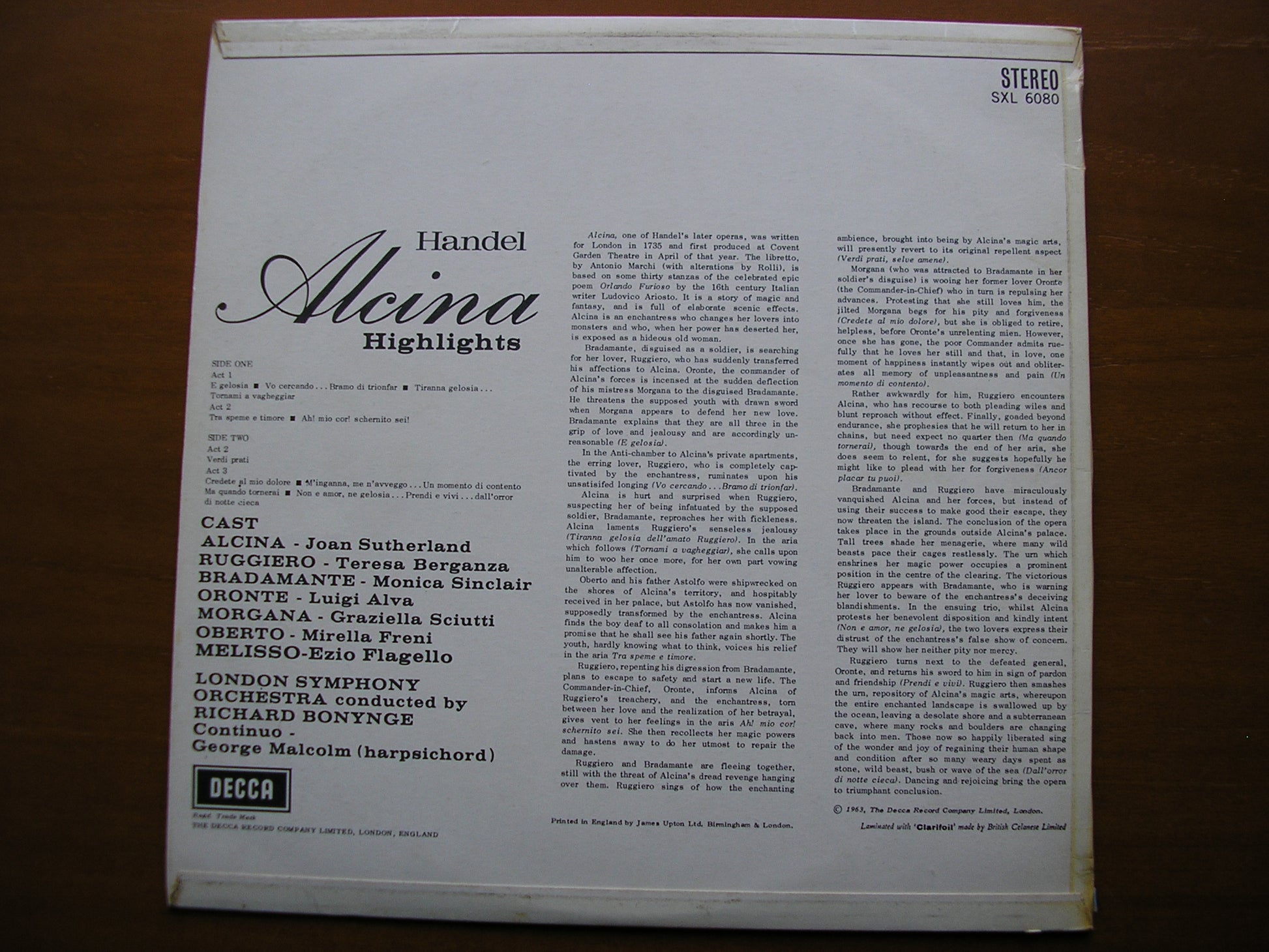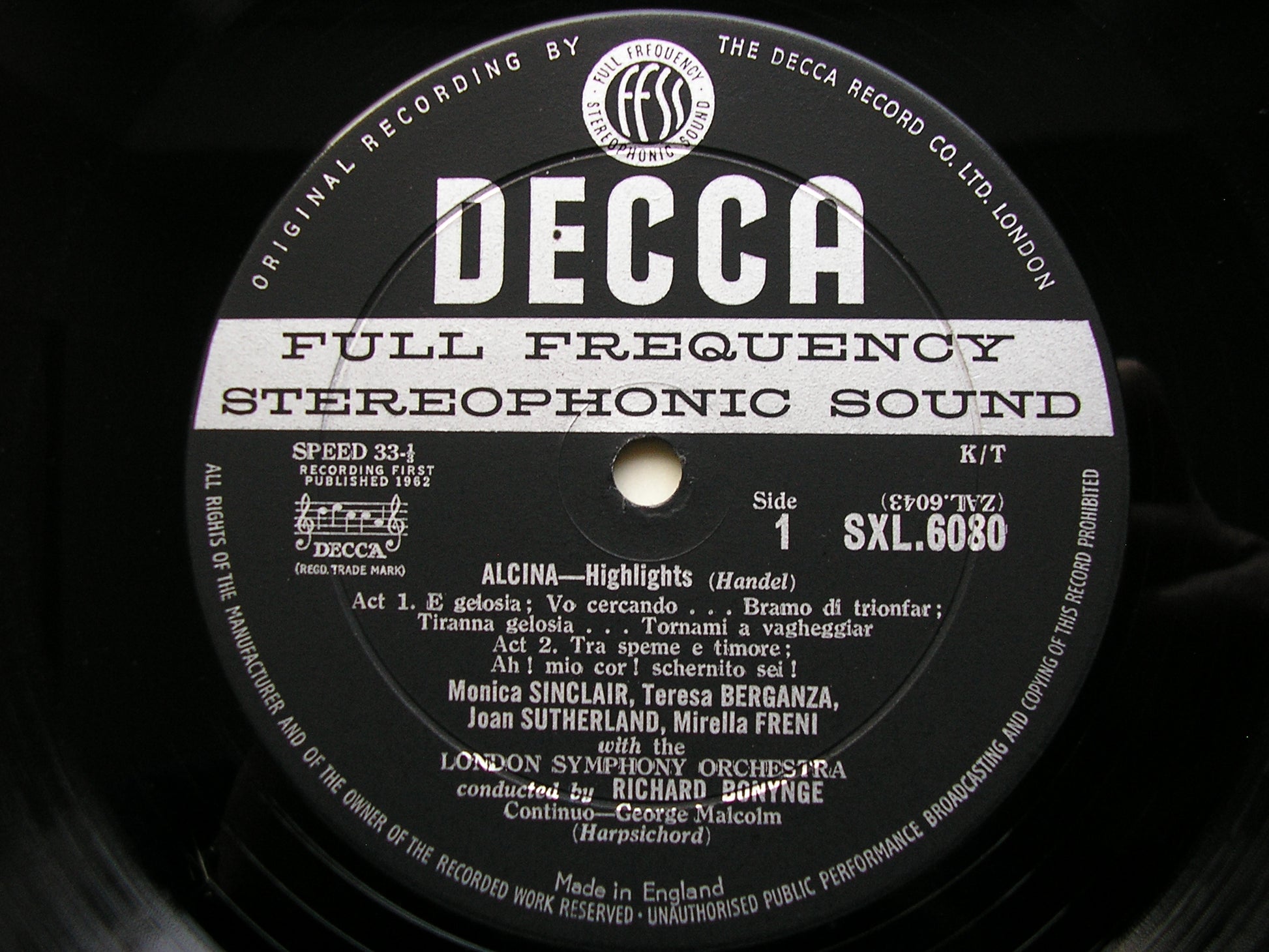 SXL 6080 HANDEL: ALCINA  excerpts    JOAN SUTHERLAND / TERESA BERGANZA / MIRELLA FRENI / LUIGI ALVA / LONDON SYMPHONY ORCHESTRA / RICHARD BONYNGE