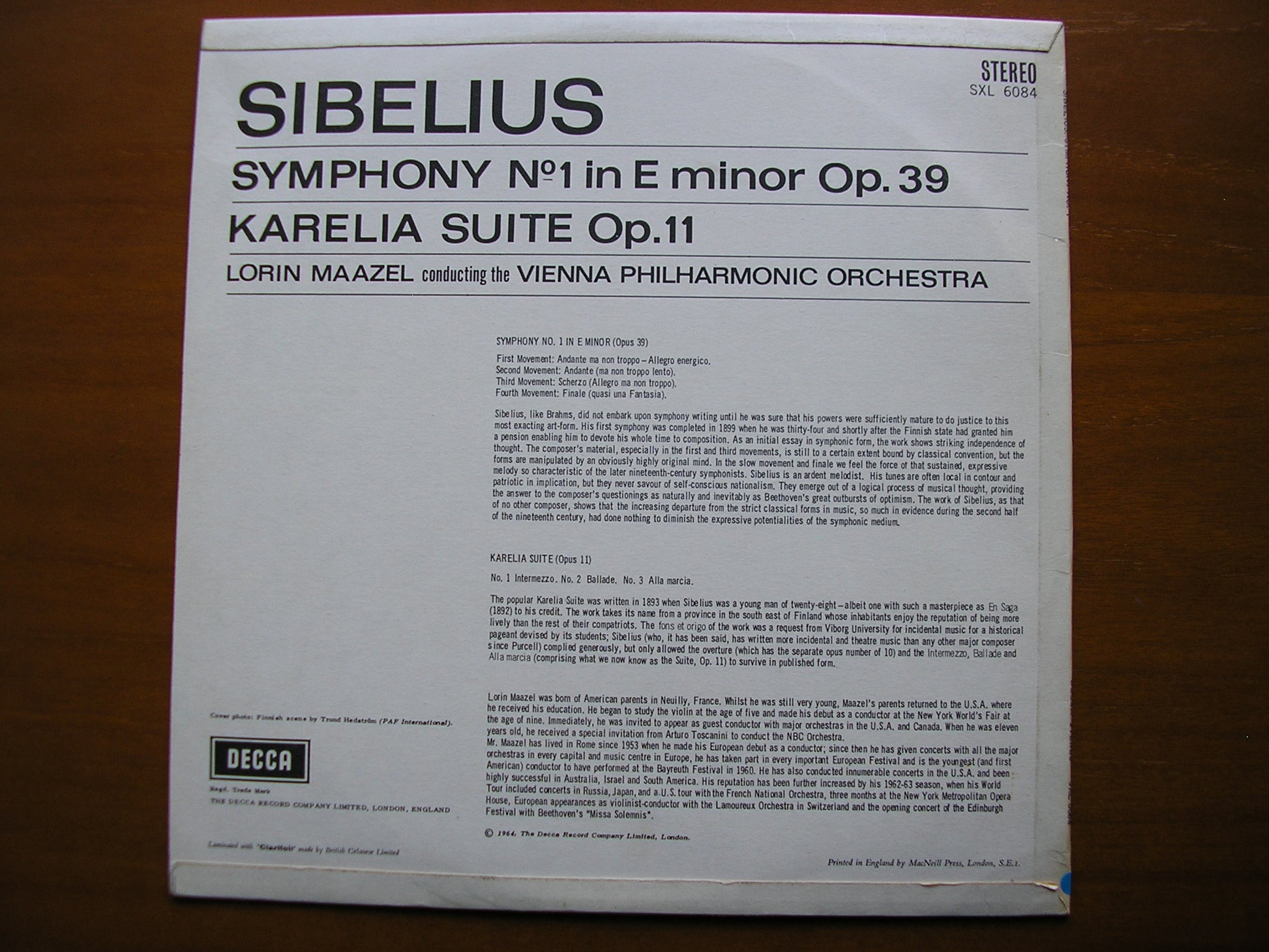SXL 6084 SIBELIUS: SYMPHONY No. 1 / KARELIA SUITE      LORIN MAAZEL / VIENNA PHILHARMONIC ORCHESTRA