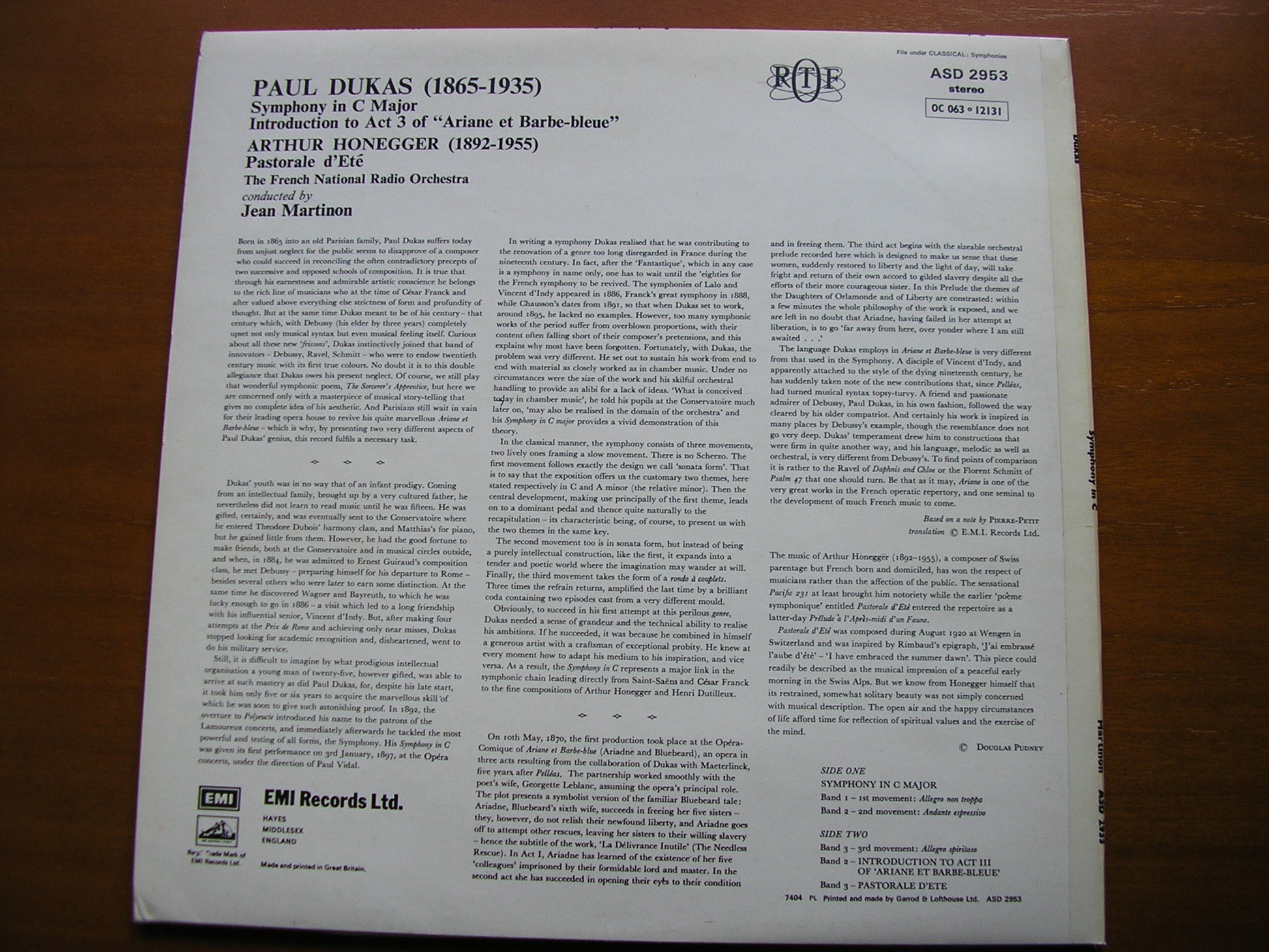 DUKAS: SYMPHONYN in C / HONEGGER: PASTORALE D'ETE MARTINON / FRENCH NATIONAL RADIO ORCHESTRA ASD 2953