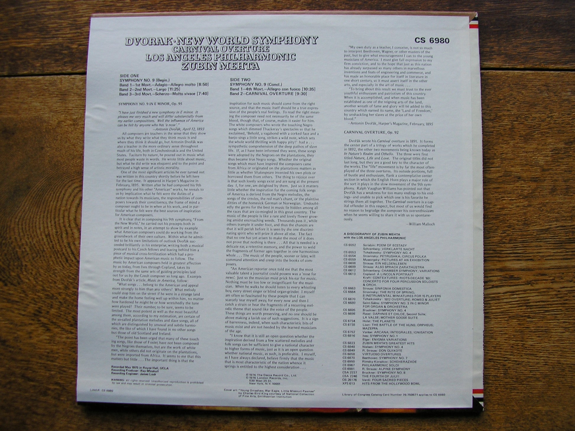 DVORAK: SYMPHONY No. 9 / CARNIVAL OVERTURE ZUBIN MEHTA / LOS ANGELES PHILHARMONIC CS 6980