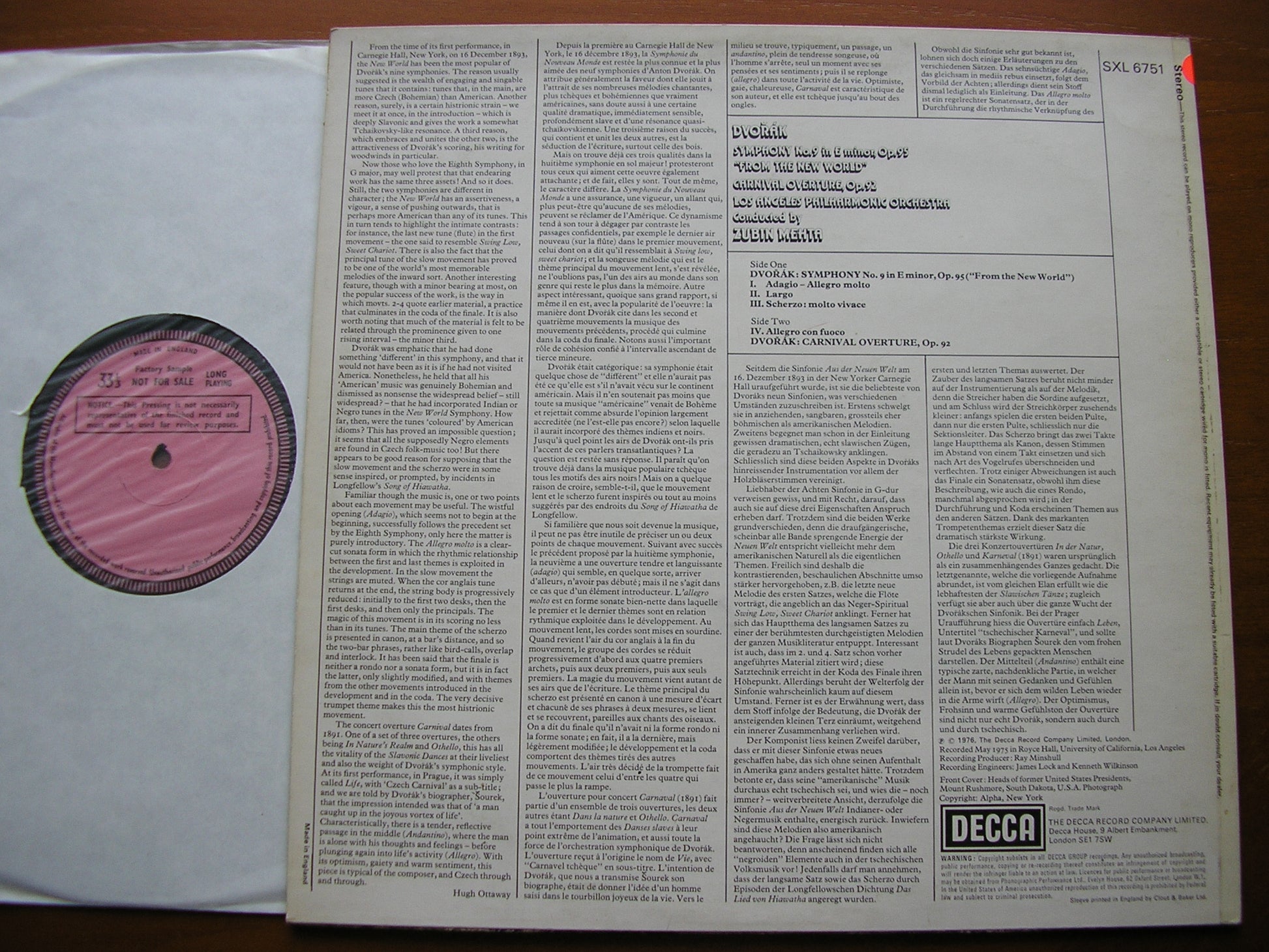 SXL 6751  DVORAK: SYMPHONY No. 9 'From the New World' / CARNIVAL OVERTURE     ZUBIN MEHTA / LOS ANGELES PHILHARMONIC ORCHESTRA